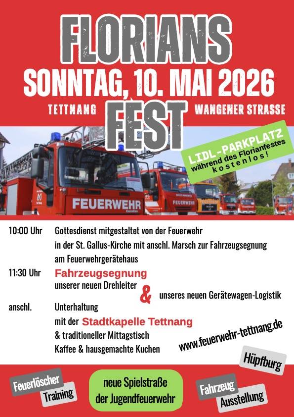 Am 10. Mai findet wieder das Floriansfest auf dem Gelände der Feuerwache Tettnang statt.