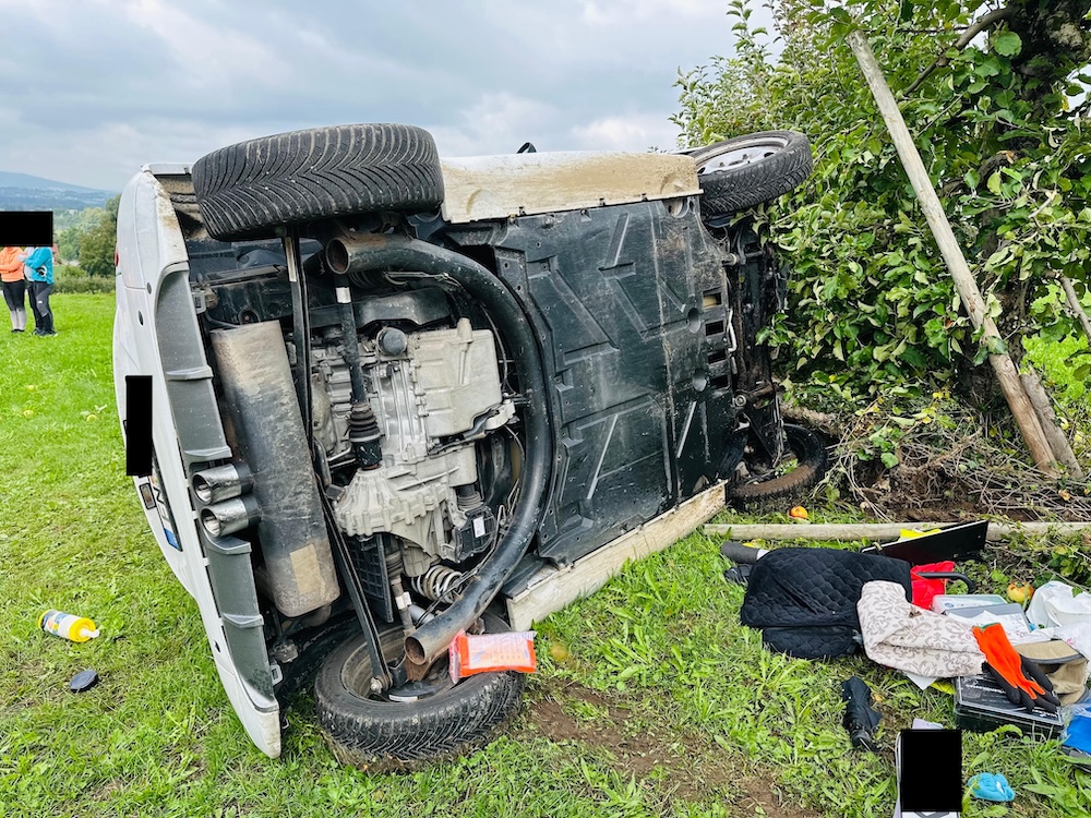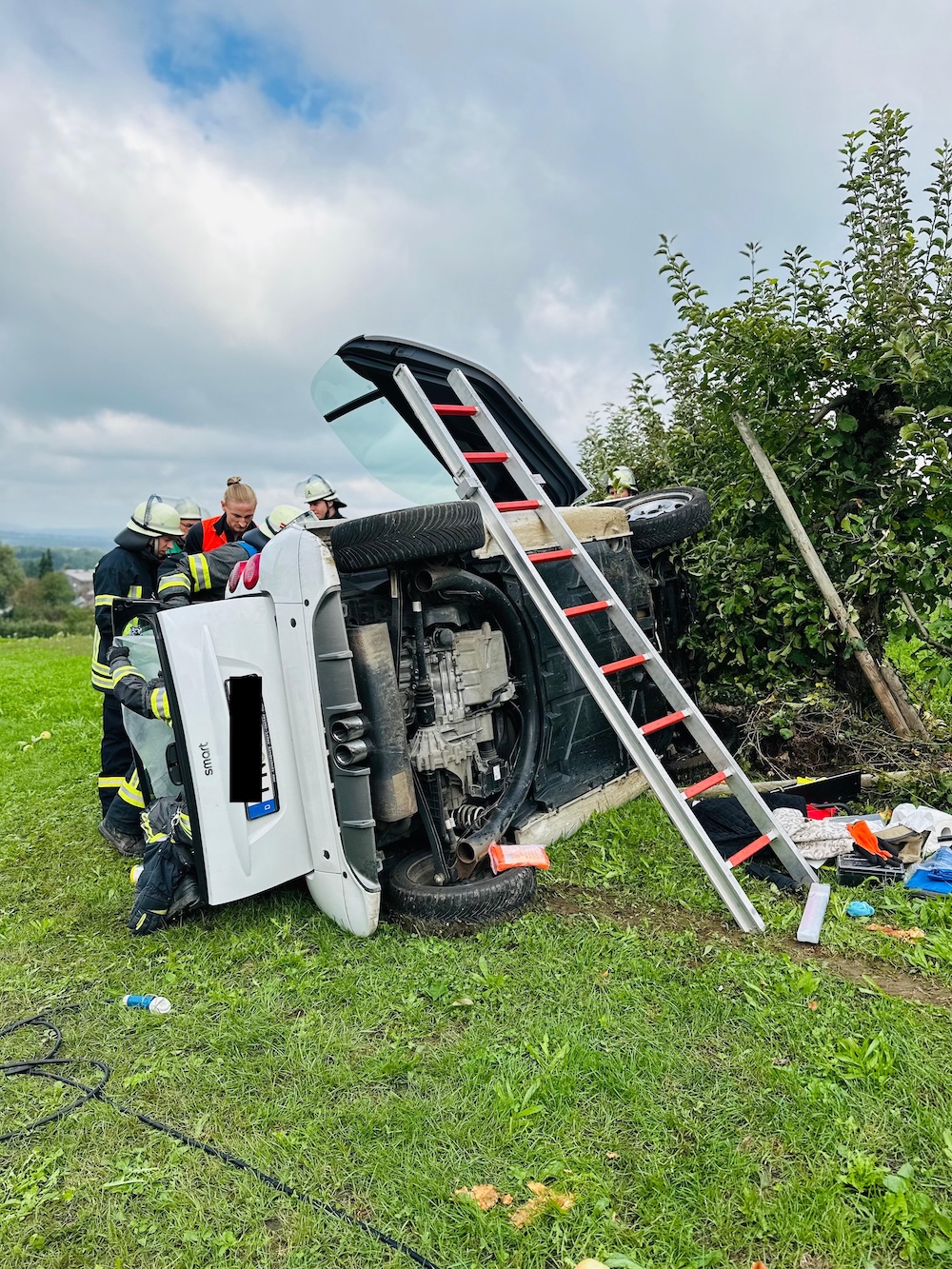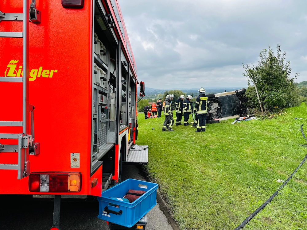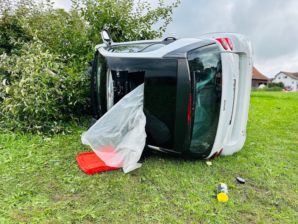 Ein Fahrer war mit seinem Smart in Folge des Unfallverlaufs von der Straße abgekommen, woraufhin das Fahrzeug auf der Seite liegen geblieben war. Die Feuerwehr sicherte das Fahrzeug zunächst gegen Umkippen und Abrutschen.