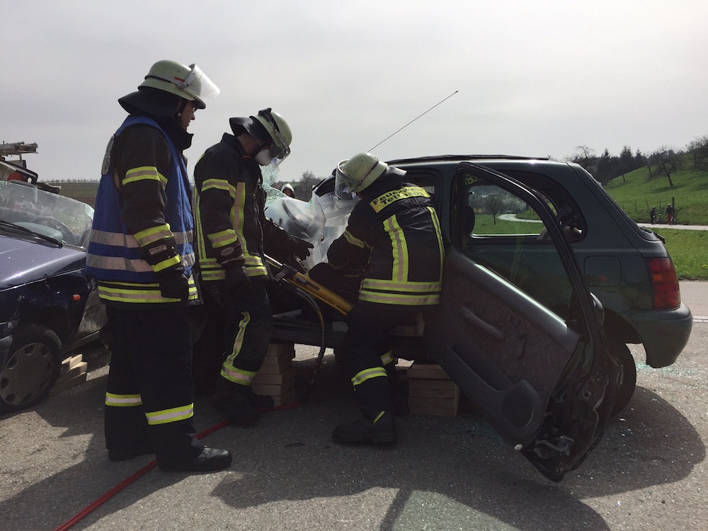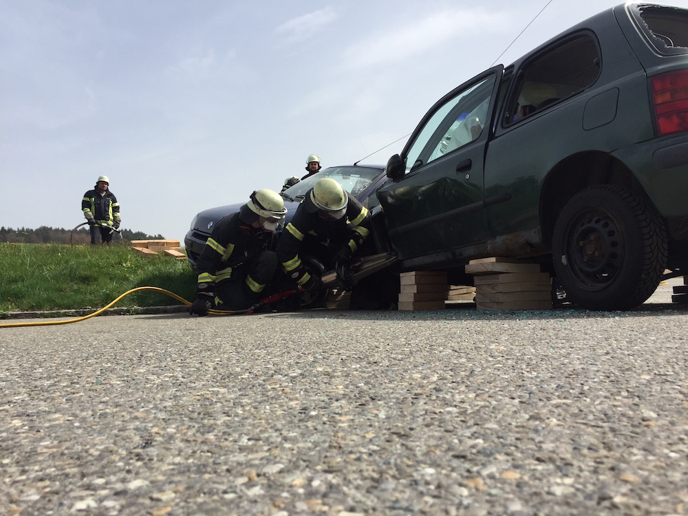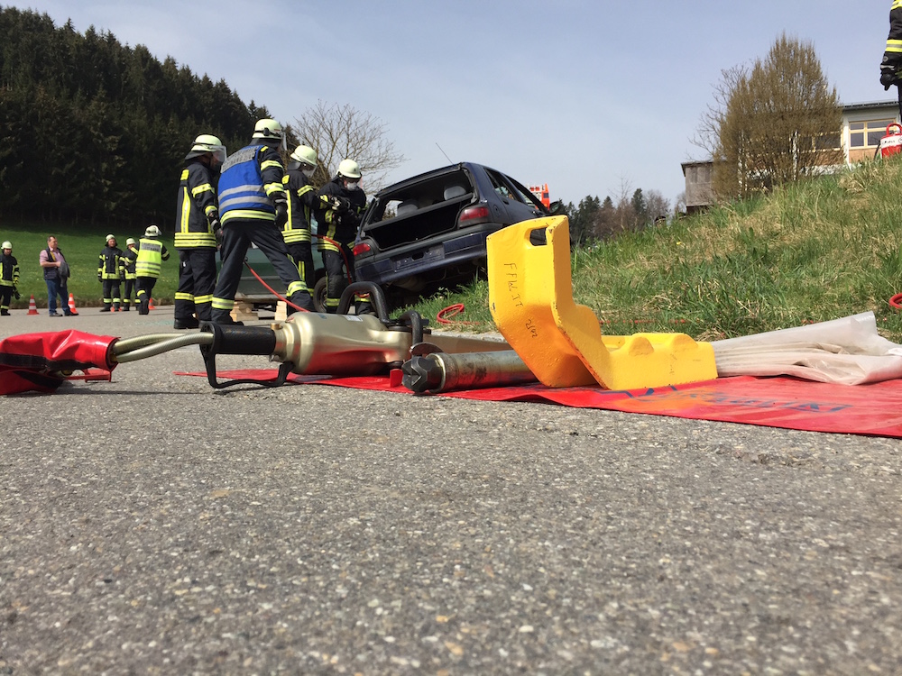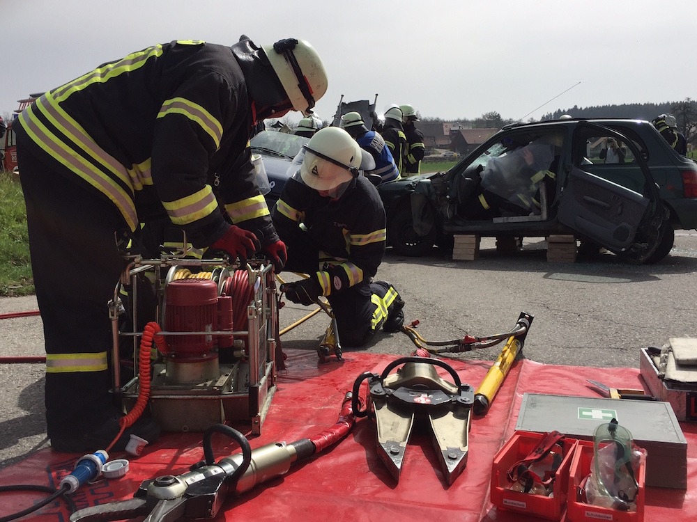 Die weiteren anrückenden Kräfte befreiten die verletzte und eingeklemmte Person aus ihrem PKW mit hydraulischem Rettungsgerät, zu welchem Rettungsschere, Rettungsspreizer und der hydraulische Zylinder zählen.
