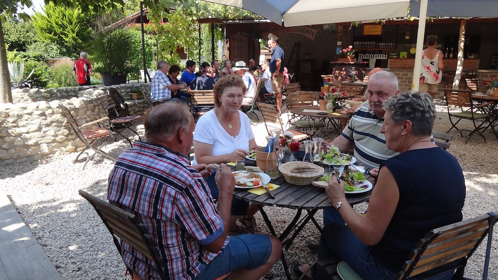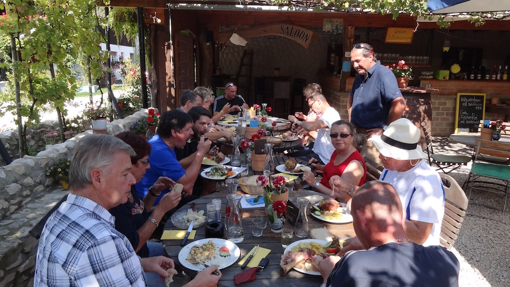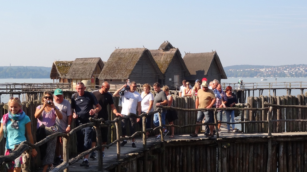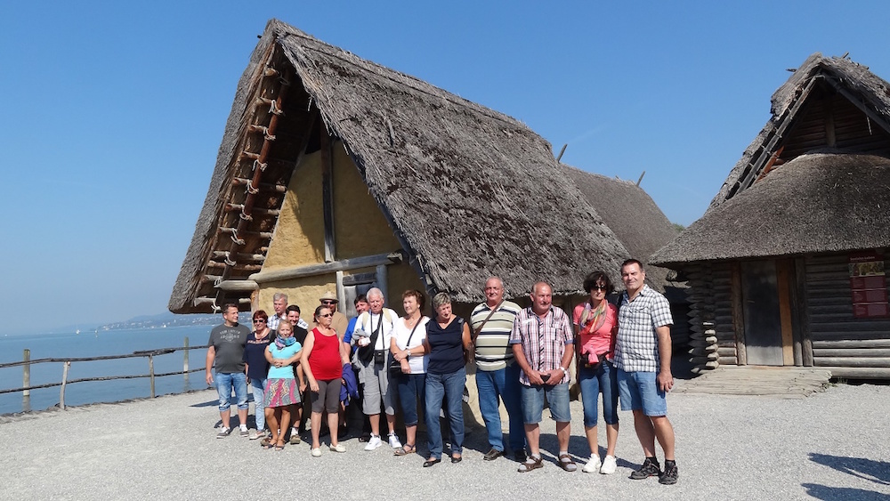 Dieser gesellige Abend endete erst spät in der Nacht. Am Samstag gab es einen Ausflug nach Unteruhldingen in das Pfahlbaumuseum. Nach der sehr interessanten Führung über das Leben unserer Vorfahren und die Geschichte der Pfahlbauten am See, brachte das Kurbähnle die Gruppe zurück zu den Fahrzeugen. Die Mittagsrast oberhalb Unteruhldingen mit deftigem Vesper, Fisch, Schweinshaxen, Most und Wein, genossen alle im Schatten der Bäume. Inzwischen zeigte das Thermometer über 30 C. Danach ging es nur ein paar Kilometer weiter nach Nußdorf. Von hier aufs Schiff für eine kleine Rundfahrt auf dem Überlingersee. Zu Kaffee und Kuchen war man wieder zurück in Tettnang. Am Abend begrüßte Sonja Hänle, als Präsidentin des Partnerschaftsausschusses Tettnang, die französischen Gäste. Nach Pizza oder Spagetti waren nach dem langen Tag alle etwas früher im Bett als den Tag zuvor.