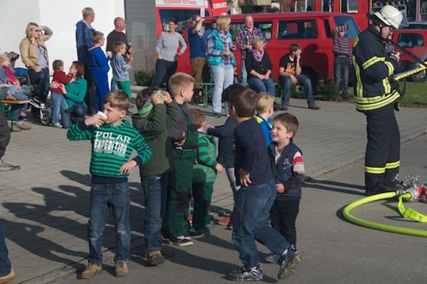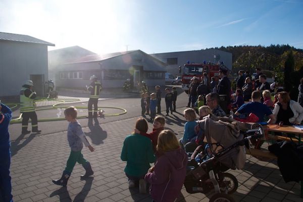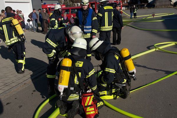 Während Tobias Knörle die Übung über Lautsprecher dem interessierten Publikum von Jung und Alt moderierte, konnten die Zuschauer gespannt dem Treiben der Feuerwehrleute zusehen. Unter der Einsatzleitung von Konrad Thanner rüsteten sich die Atemschutzgeräteträger bereits auf der Anfahrt aus, um sofort mit der Menschenrettung beginnen zu können. An der Einsatzstelle wurde nebst der Menschenrettung mit dem Aufbau der Wasserversorgung für die Brandbekämpfung begonnen.