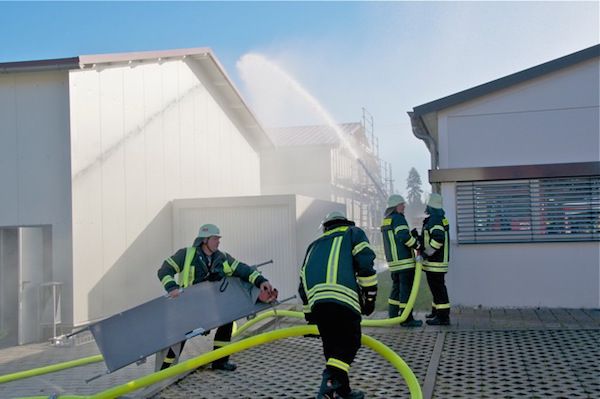 Auch die Jugendfeuerwehr durfte an der Übung mitwirken und baute eine Wasserversorgung auf. Nachdem die vermisste Person im dem verqualmten Gebäude aufgefunden und mittels Fluchthaube aus dem Gebäude geschaffen wurde, setzte der Atemschutztrupp seine Arbeit mit der Brandbekämpfung im Inneren der Halle fort. Etwa dreißig Minuten nach Übungsbeginn konnte die Meldung "Feuer aus" und damit das Übungsende bekanntgegeben werden.