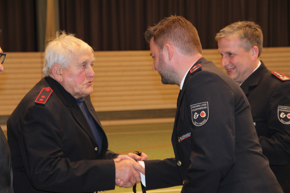 Eine ganz besondere Ehrung fiel an diesem Abend auf Robert Ruppaner. Seit dem 01. April 1953 ist Ruppaner Mitglied der Tettnanger Feuerwehr und somit seit unglaublichen 70 Jahren der Tettnanger Wehr treu verbunden.
