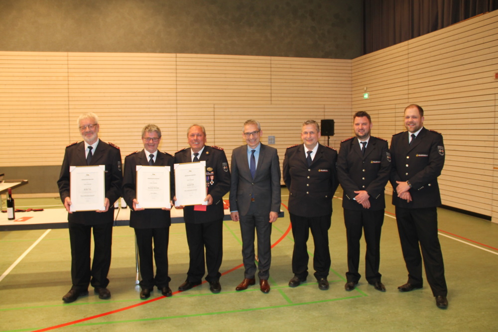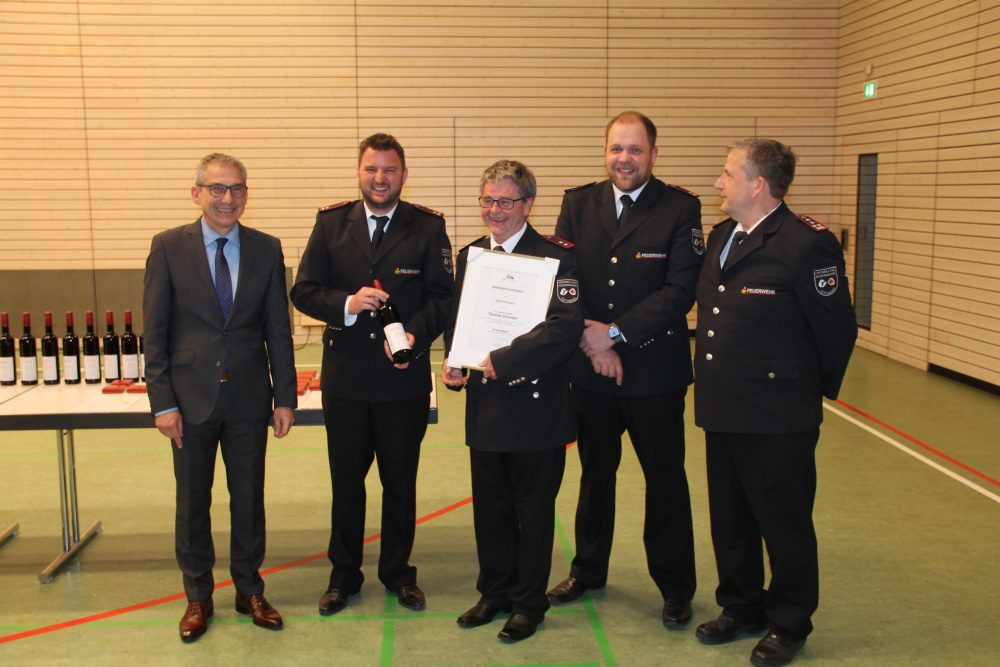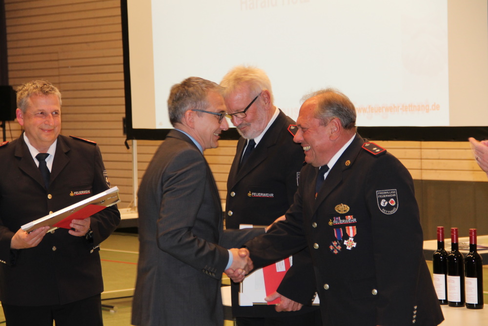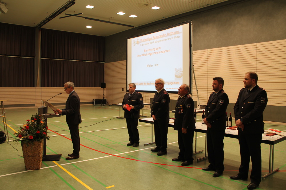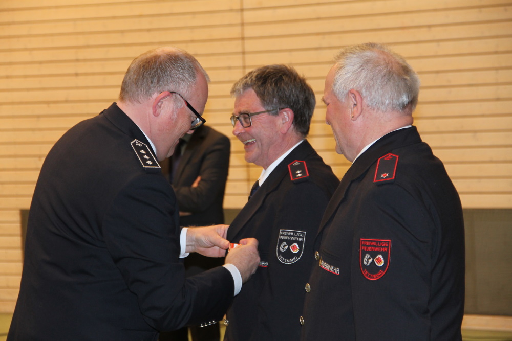 Seitens dem Bodenseekreis war der stellvertretende Kreisbrandmeister Dagobert Heß nach Laimnau gekommen. Heß bedankte sich dabei für das Engagements der Tettnanger Wehr im Kreis. Dabei durfte Heiß gemeinsam mit den Kommandanten Wolf, Döpke und Rauscher sowie mit Bürgermeister Walter die Feuerwehr Ehrenabzeichen verleihen.