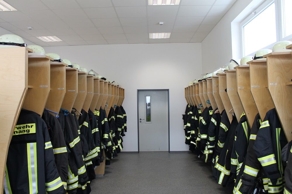 Neben der Fahrzeughalle befinden sich die Umkleiden der Feuerwehrangehörigen, dort hat jeder Kamerrad seinen eigenen Spind mit Einsatzkleidung.