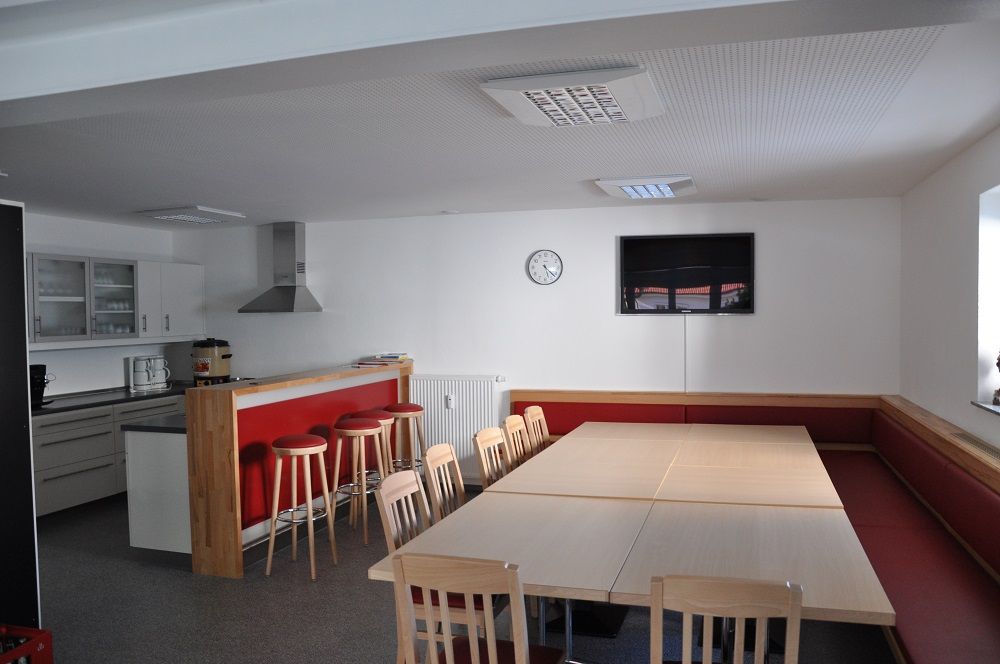 Großzügigen Platz bietet das erste Obergeschoss. Hier können zu Übungs- und Fortbildungszwecken Stühle und Tische gestellt werden. Weiterhin können in dem kombinierten Sozial- und Schulungsraum durch die vorhandene Küche Speisen während Einsätzen oder nach Übungen zubereitet werden.