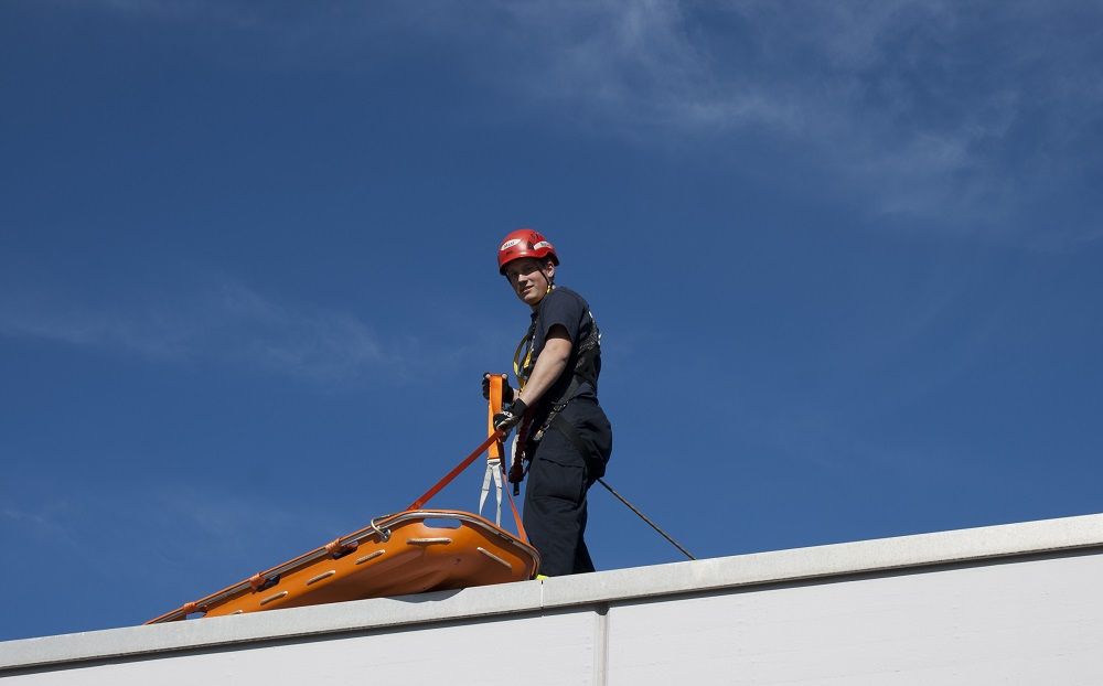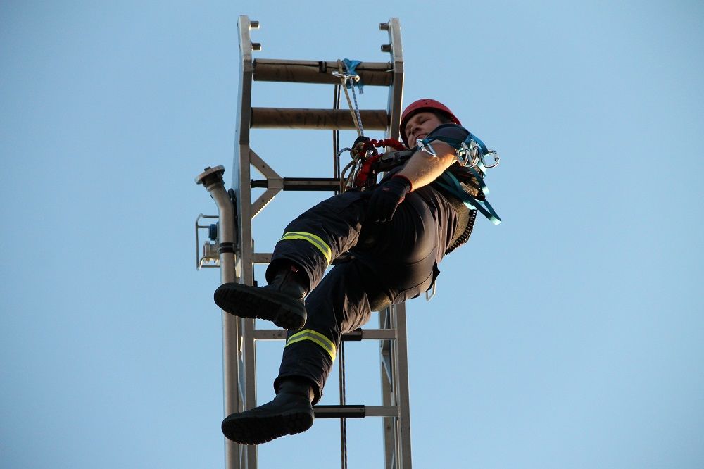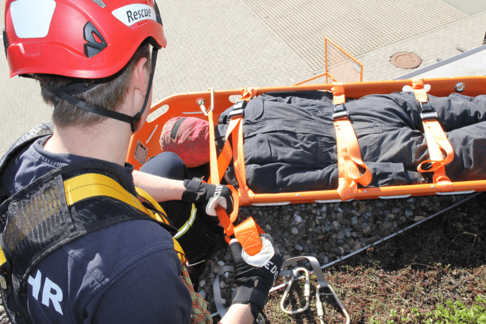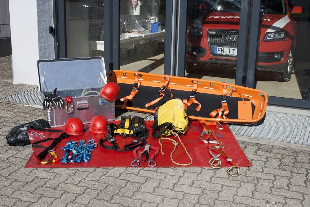 Bei der Rettung von Menschen und Tieren, aber auch bei der Brandbekämpfung oder technischen Hilfeleistungen müssen sich Feuerwehrleute manchmal in gefährliche Höhen begeben. Um hier sicher arbeiten zu können, trainieren die Mitglieder der Fachgruppe Absturzsicherung regelmäßig den richtigen Umgang mit Seilen und Gurten. Das wichtigste Arbeitswerkzeug ist der Gerätesatz Absturzsicherung. Dieser enthält neben Klettergurten und -helmen auch zwei Seile mit jeweils 60m Länge und diverse Bandschlingen, Karabiner, Bandfalldämpfer und weiteres Material.