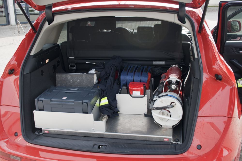 Im Kofferraum sind auf einer herausnehmbaren Aluminium-Trägerplatte unter anderem ein Hi-Press-Löscher, Halligan-Tool als auch Materialien zur Verkehrsabsicherung verstaut.