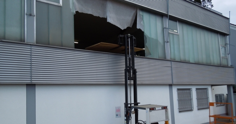 Nachdem eine Gebäudeverkleidung bereits durch einen Unfall vorgeschädigt war wurde diese durch den Sturm komplett gelöst.