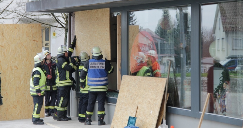 Nach einem Einbruch in ein Restaurant wurde die zerstörte Scheibe durch die Feuerwehr verschlossen. Hierbei setzte die Feuerwehr OSB Platten ein.
