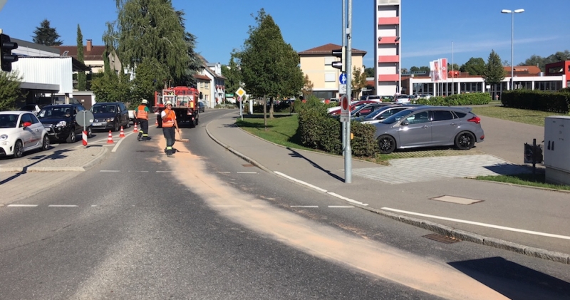 Ein PKW verlor in der Tettnanger Innenstadt Kühlflüssigkeit. Die Flüssigkeit wurde mittels Ölbindemittel aufgenommen, außerdem wurden Ölspurschilder aufgestellt.