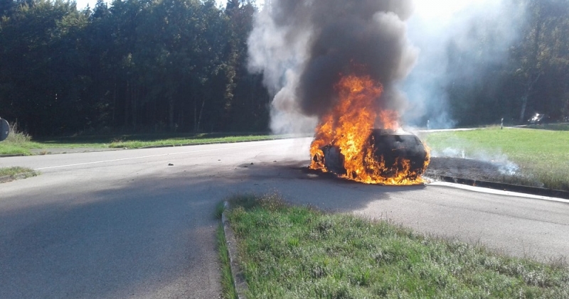F1 - PKW in Vollbrand, Diesel droht in Gewässer zu laufen