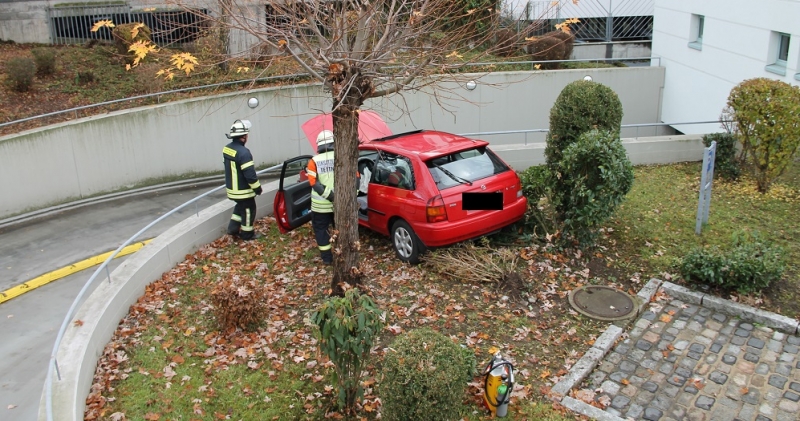 In der Tettnanger Innenstadt ereignete sich ein Verkehrsunfall: Eine Frau prallte mit ihrem PKW gegen die Mauer einer Tiefgarageneinfahrt.