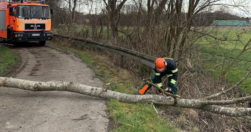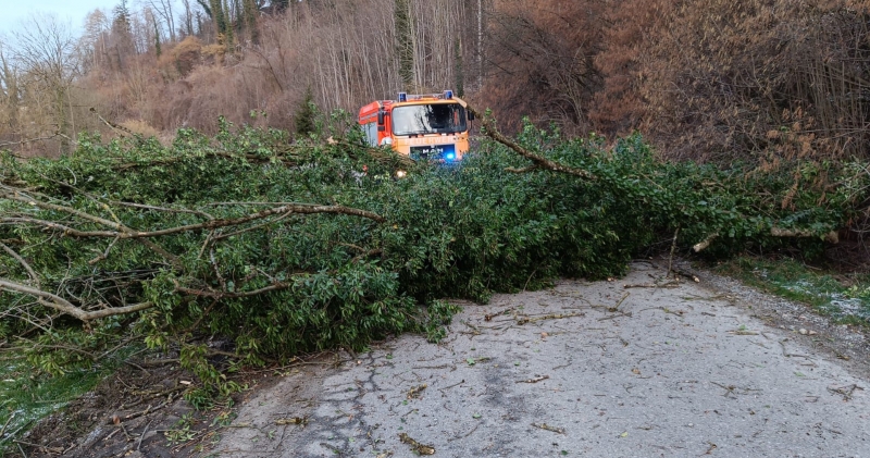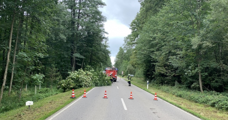 Ein großer, auf der Straße liegender Baum musste durch die Feuerwehr zersägt werden. Anschließend wurde die gesperrte Fahrbahn wieder freigegeben.
