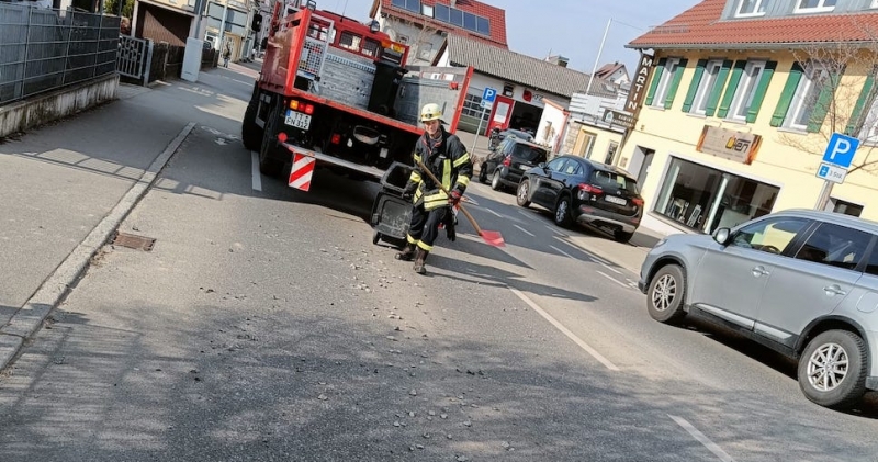 Durch einen technischen Defekt kam es in der Tettnanger Innenstadt zu einer Ölspur. Die Feuerwehr nahm das Öl auf und stellte Ölspurschilder.