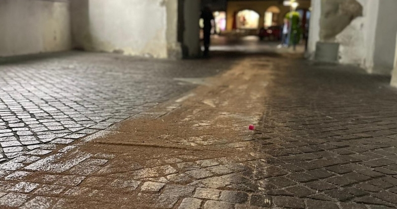 In der Innenstadt kam es zu einer weitläufigen Verunreinigung der Straße mit Kies. Das Kies wurde aufgenommen und die Straße an die Polizei übergeben.
