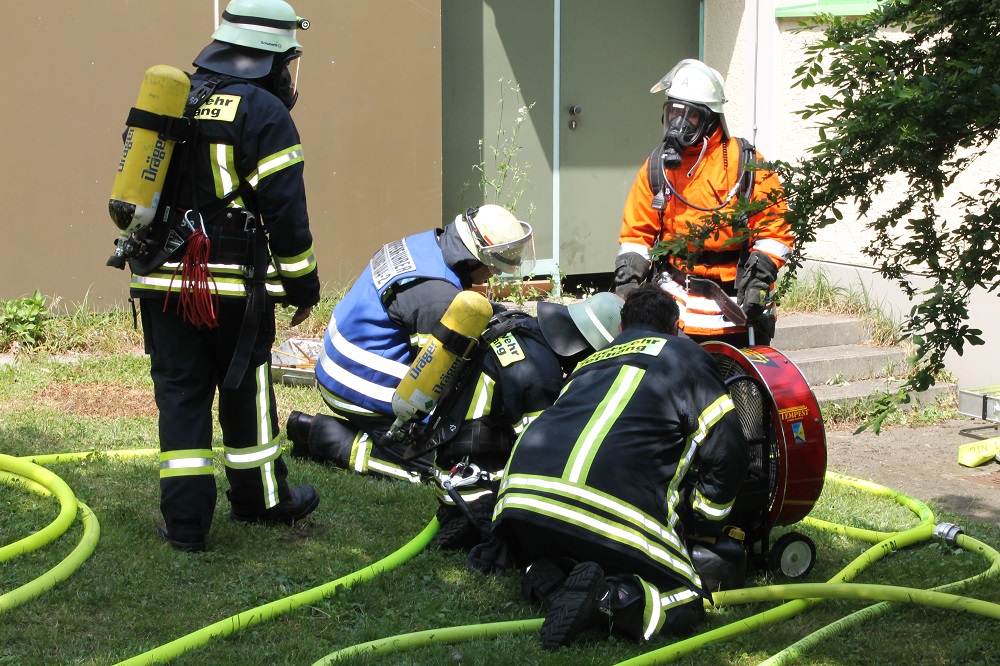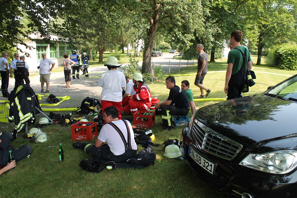 Die Kameraden des SEG vom DRK OV Tettnang führten bei den eingesetzten Atemschutzgeräteträgern Prüfungen der Vitalwerte durch, was nicht zuletzt bei den hohen Außentemperaturen sinnvoll war.