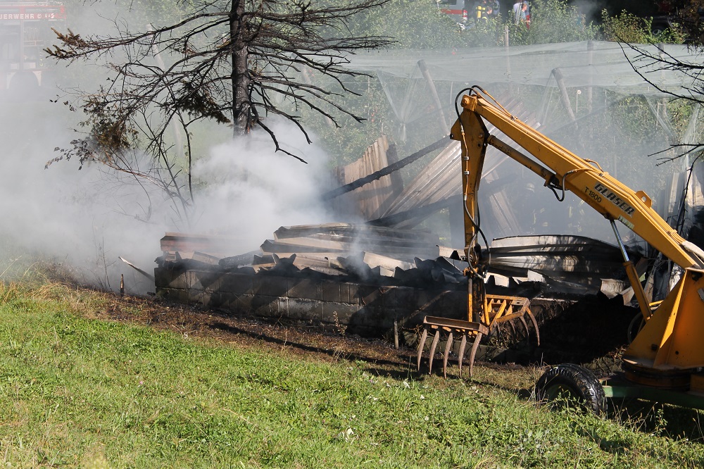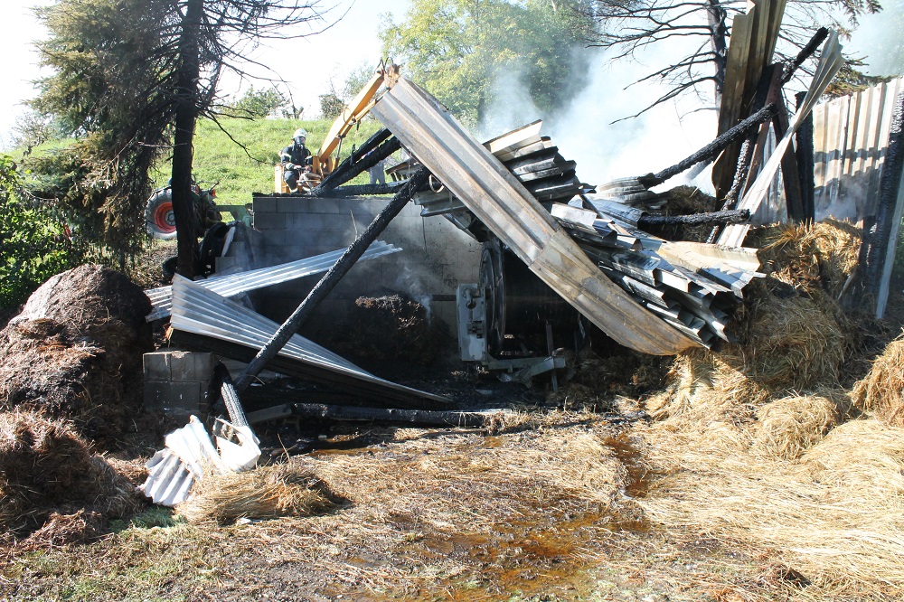 Mittels Bagger wurde noch das Wellblechdach entfernt und das Heu zum besseren Löschen auseinandergezogen.
