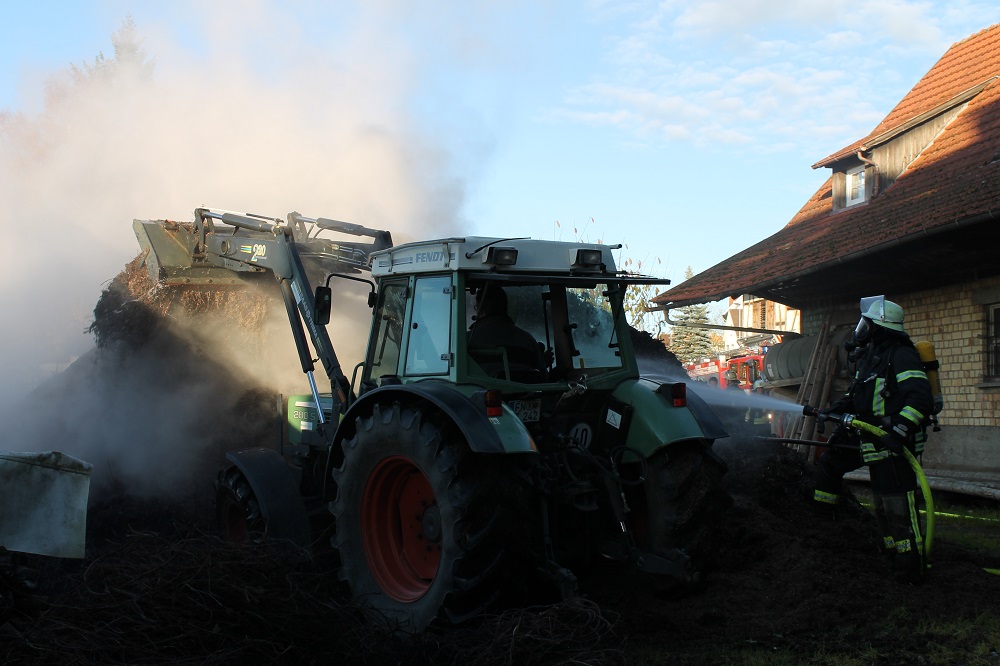 Mit mehreren Trupps unter Atemschutz und mittels C-Rohren konnte mithilfe eines Traktors, welcher das Brandgut auseinander gezogen hatte, das Feuer gelöscht werden.