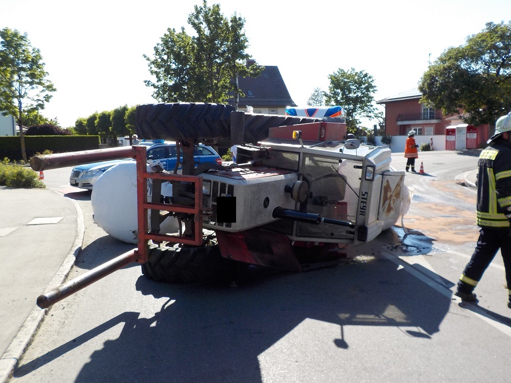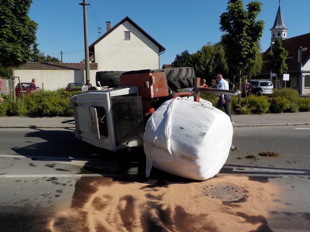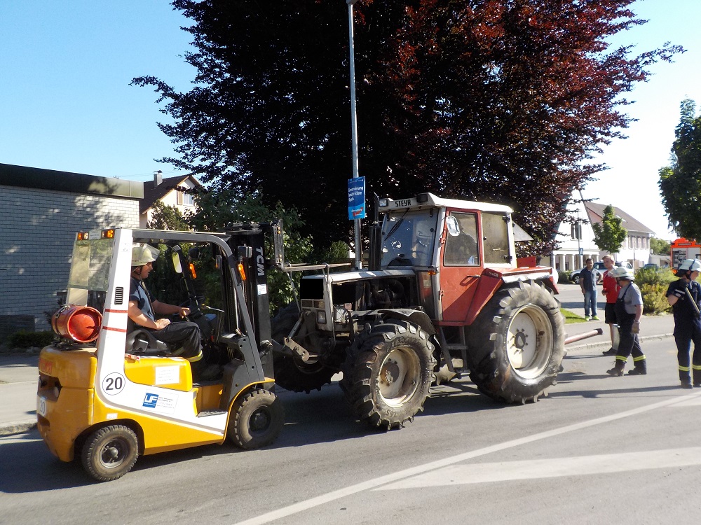 Ferner wurden die Siloballen, welche auf der Straße lagen, zur Seite geschafft und der Traktor mittels Seilwinde des Rüstwagens aufgestellt. Der Traktor wurde anschließend von der Straße entfernt.
