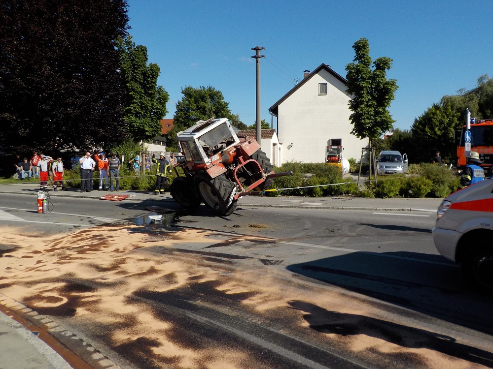 In der Martin-Luther-Straße, etwa 50 Meter von der DRK-Wache und wenige Hundert Meter von der Feuerwache entfernt, kippte während der Fahrt ein Traktor in der Linkskurve um.