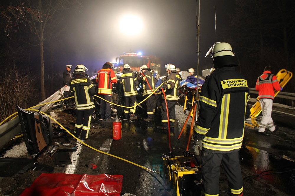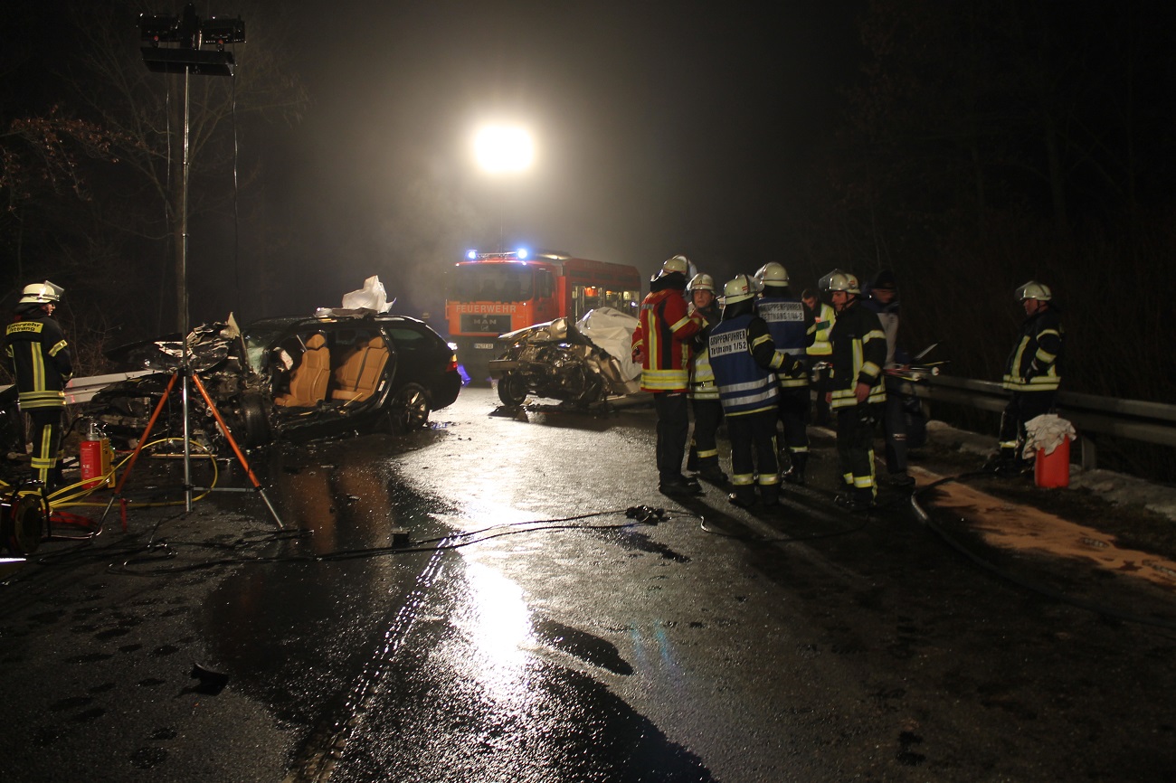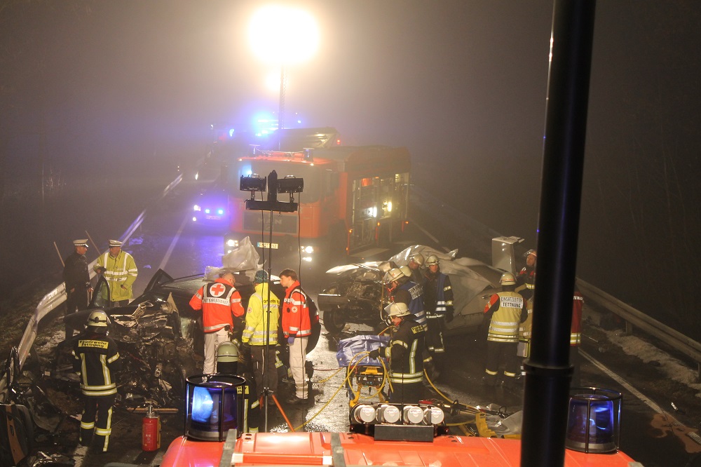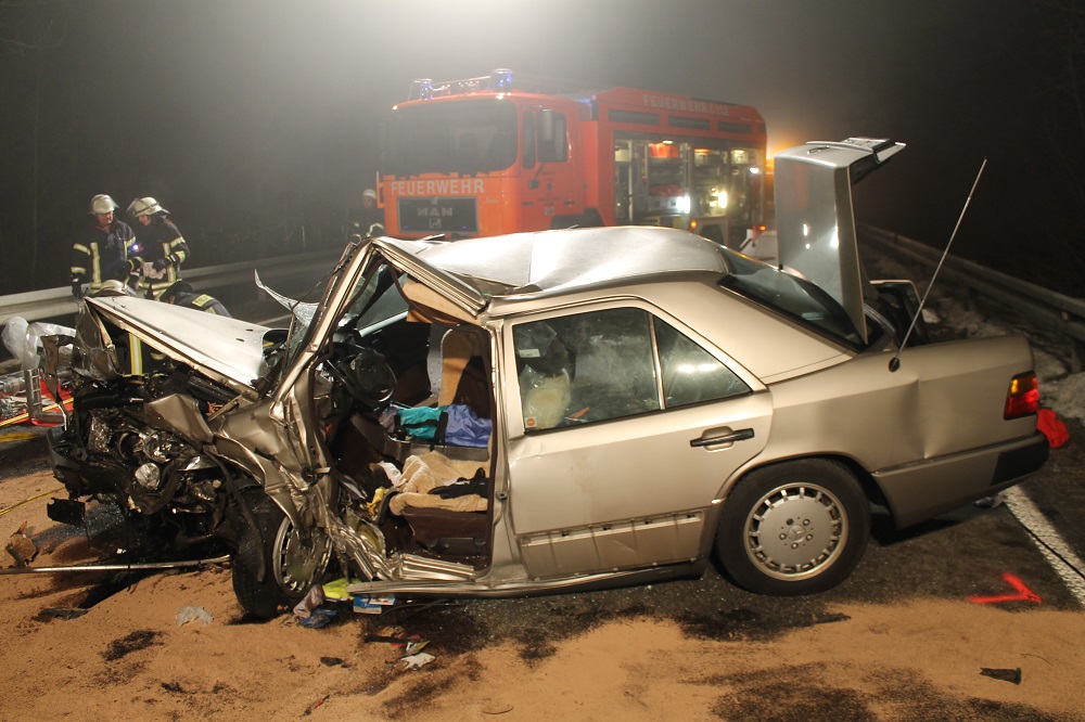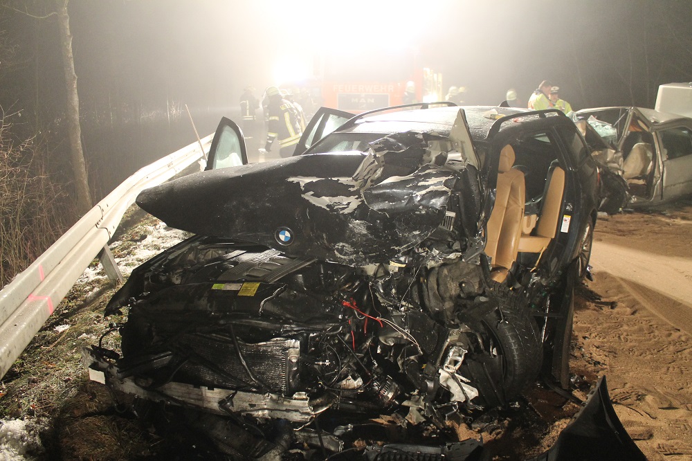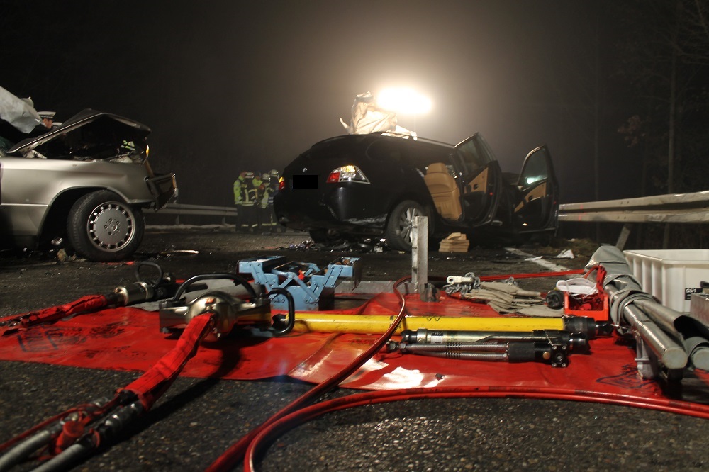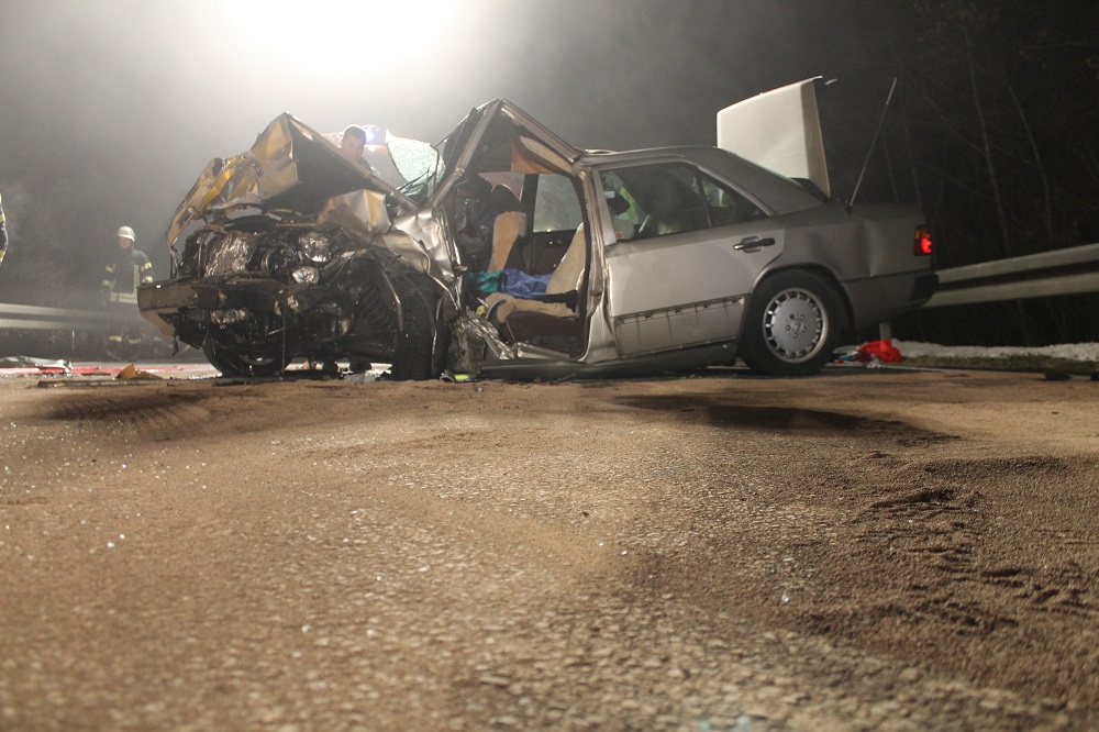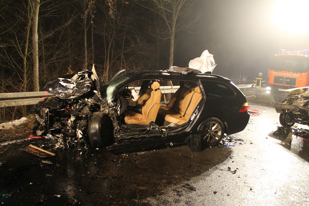 Auf der Straße stießen ein Mercedes und ein BMW 5er frontal zusammen. Für den Fahrer des Mercedes kam jedoch jede Hilfe zu spät. Die weiteren drei Insassen (davon ein Kind) des Mercedes erlitten zum Teil lebensbedrohliche Verletzungen.