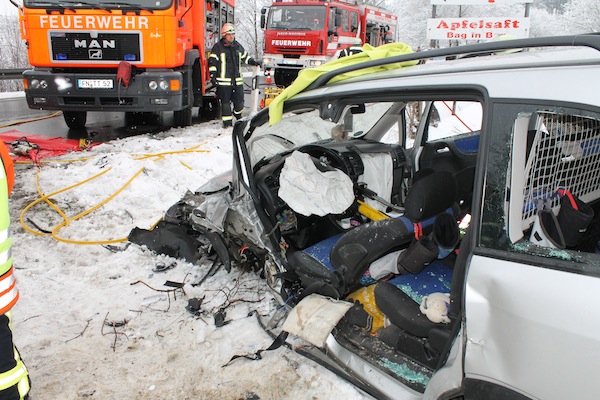 Der Opel-Fahrer wurde in seinem Fahrzeug eingeklemmt, woraufhin er mit hydraulischem Rettungsgerät (Schere, Spreizer und Zylinder) aus seinem PKW befreit werden musste.