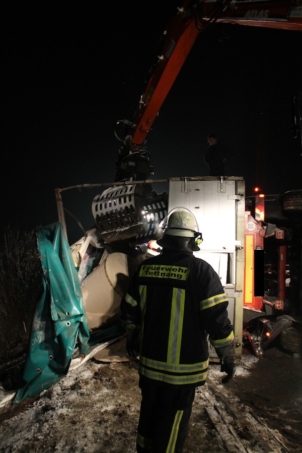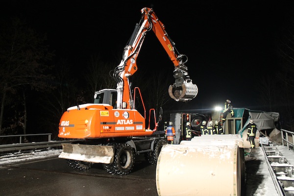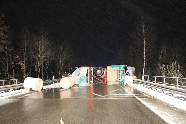 So auch in Tettnang: Auf der B 467 in Richtung Ravensburg kippte ein LKW samt Anhänger um. Seine Ladung, Papierrollen mit jeweils einer Tonne Gewicht, landeten bei dem Unfall auf der Straße.