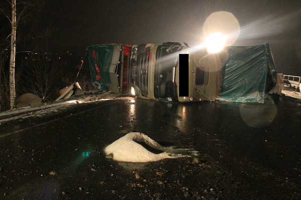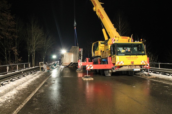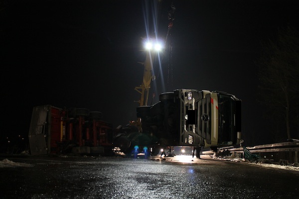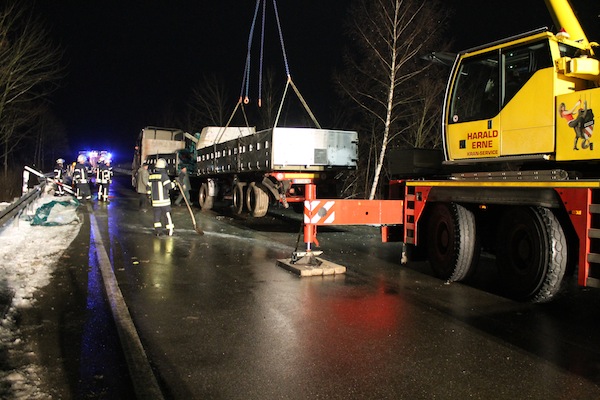 Das Frachtgut wurde mit einem Bagger auf den beiden Straßen "eingesammelt" und auf einen LKW verladen. Anschließend wurde mit einem Autokran der LKW samt Anhänger (welcher ursprünglich 23 Tonnen Fracht geladen hatte) aufgerichtet.