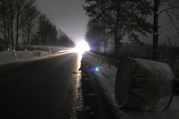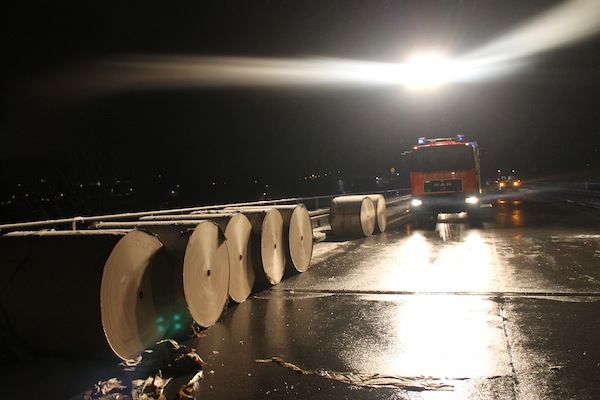 Da die Straße auf diesem Abschnitt abschüssig ist, rollten die Papierrollen aufgrund ihrer hohen Masse z.T. über 350 Meter die Bundesstraße hinunter.