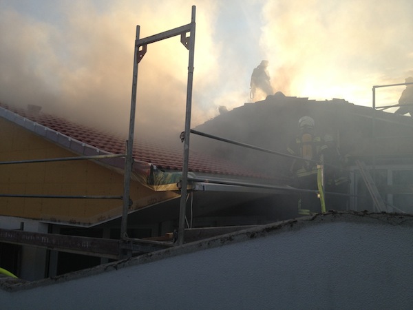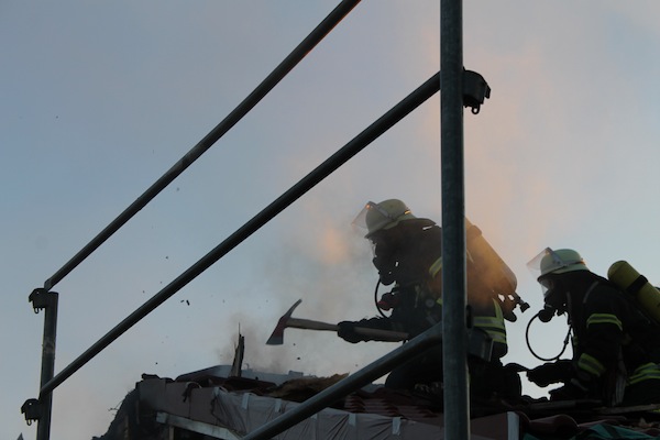 Während ein Trupp im Innenangriff mit einem C-Rohr im Einsatz war, öffnete parallel ein weiterer Trupp unter Atemschutz das Dach des Gebäudes. Daraufhin schlugen dem Trupp die Flammen entgegen. Um das Feuer löschen zu können, mussten die Dachplatten stellenweise mittels Einreißhaken und Axt entfernt werden.
