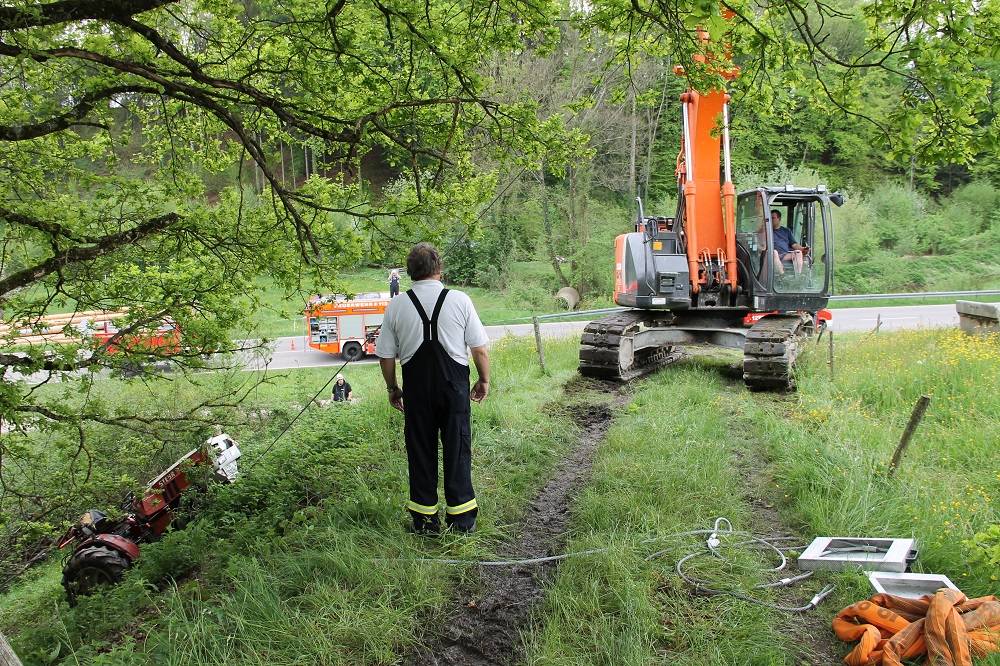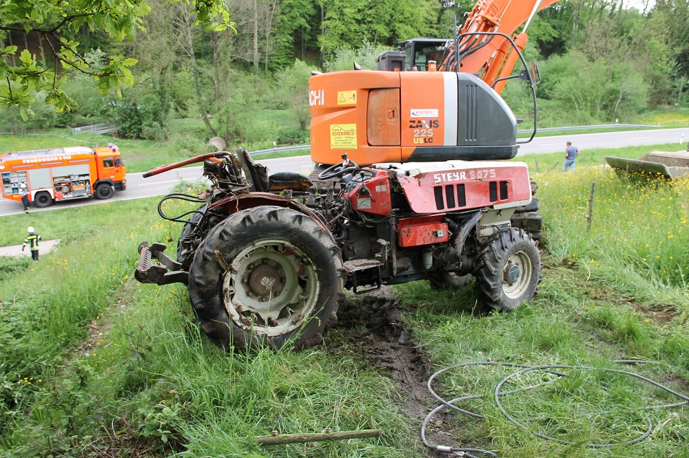 Die Feuerwehr musste den Fahrer, welcher an der Unfallstelle verstarb, bergen. Außerdem wurden die Betriebsstoffe des Traktors aufgenommen, ehe das Gefährt mittels Bagger geborgen werden konnte.
