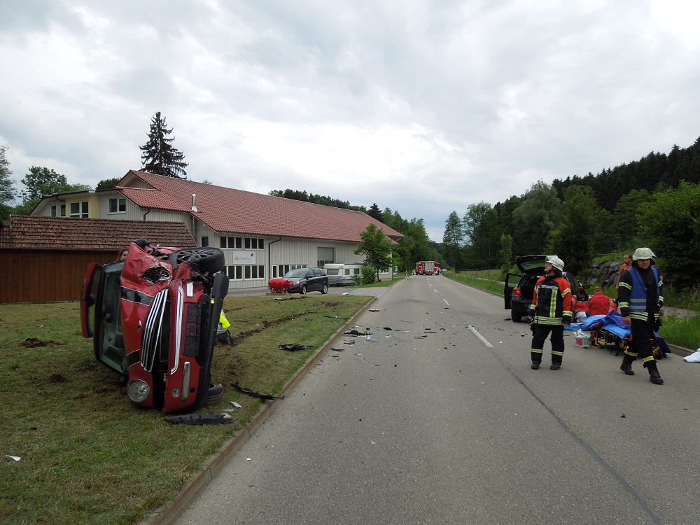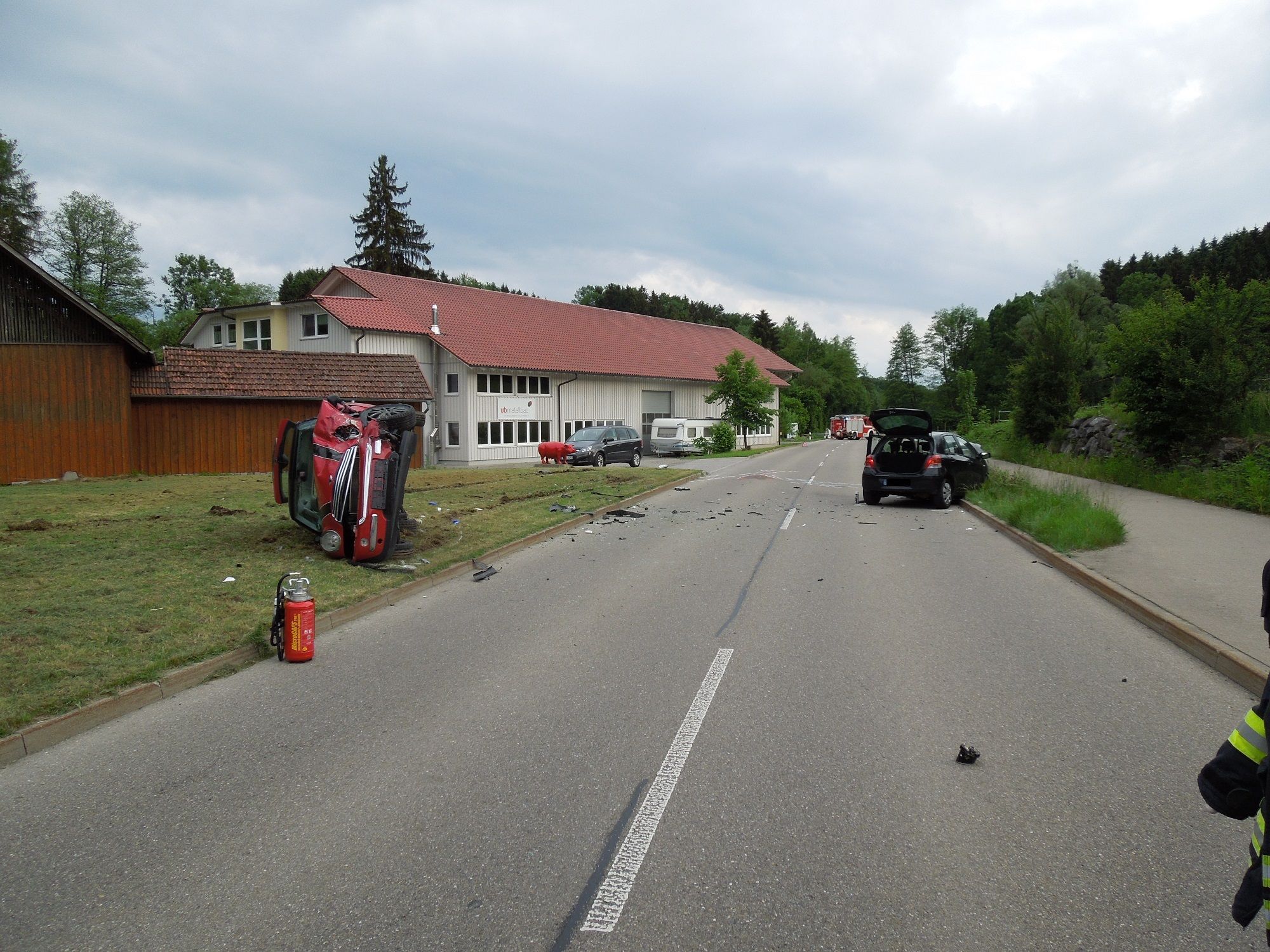 Auf der K 7716 bei Wiesertsweiler stießen zwei PKW (ein Mini und ein Toyota) zusammen. Durch die Wucht des Aufpralls blieb der Mini auf einer Wiese auf der Seite liegen. Beim Absetzen des Notrufs wurde bereits mitgeteilt, dass sich keine Personen mehr in den PKW befinden würden.