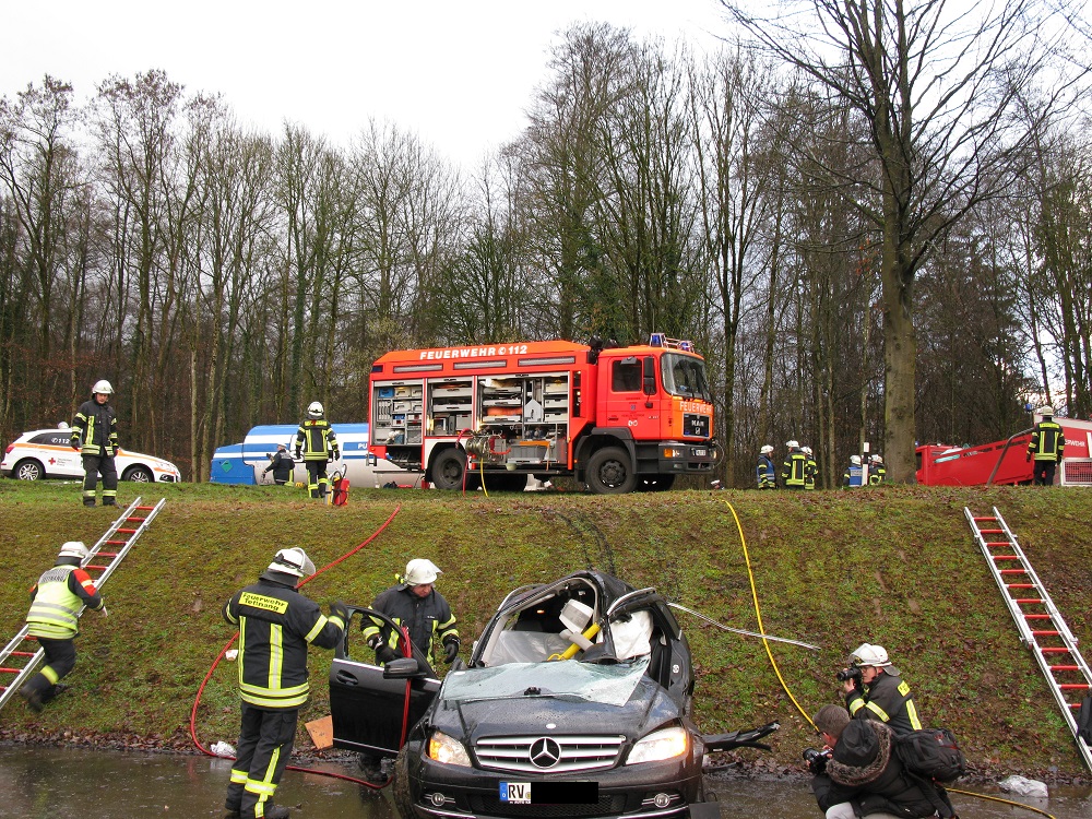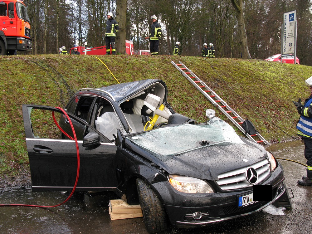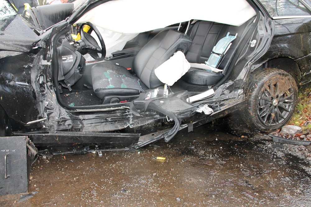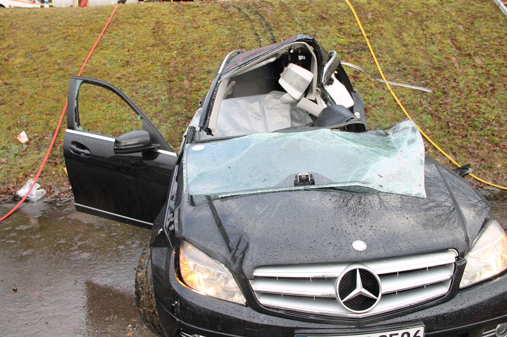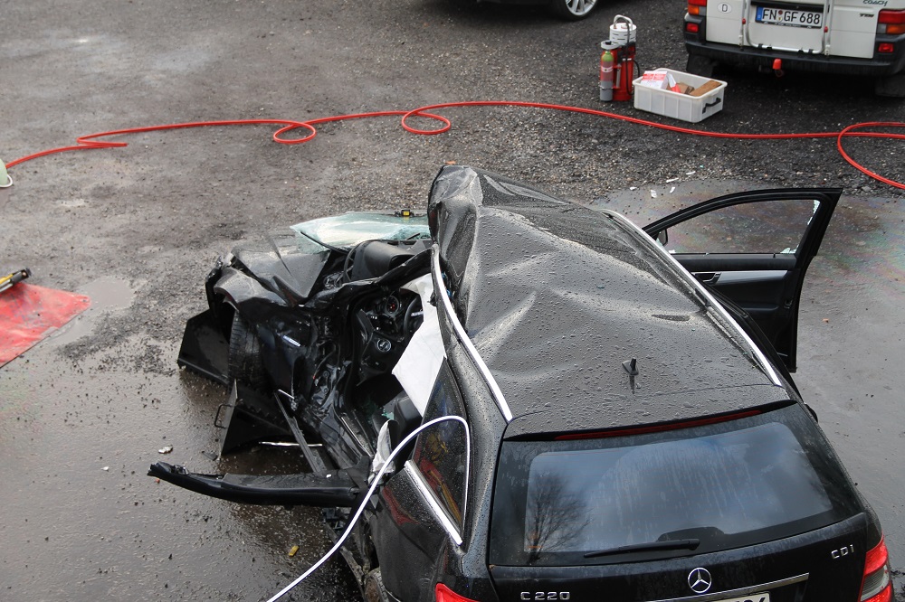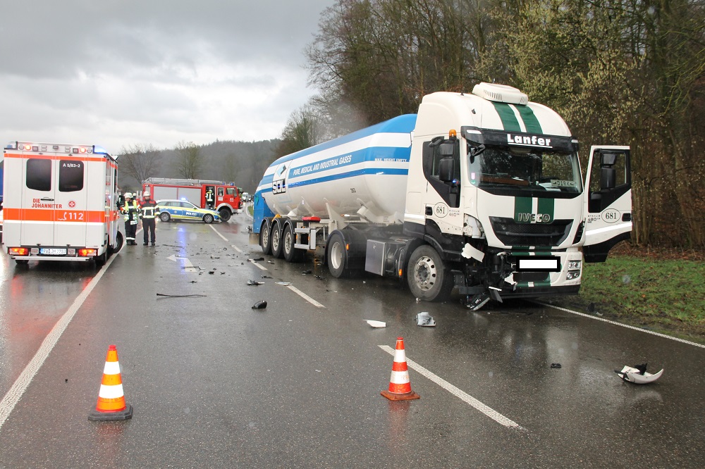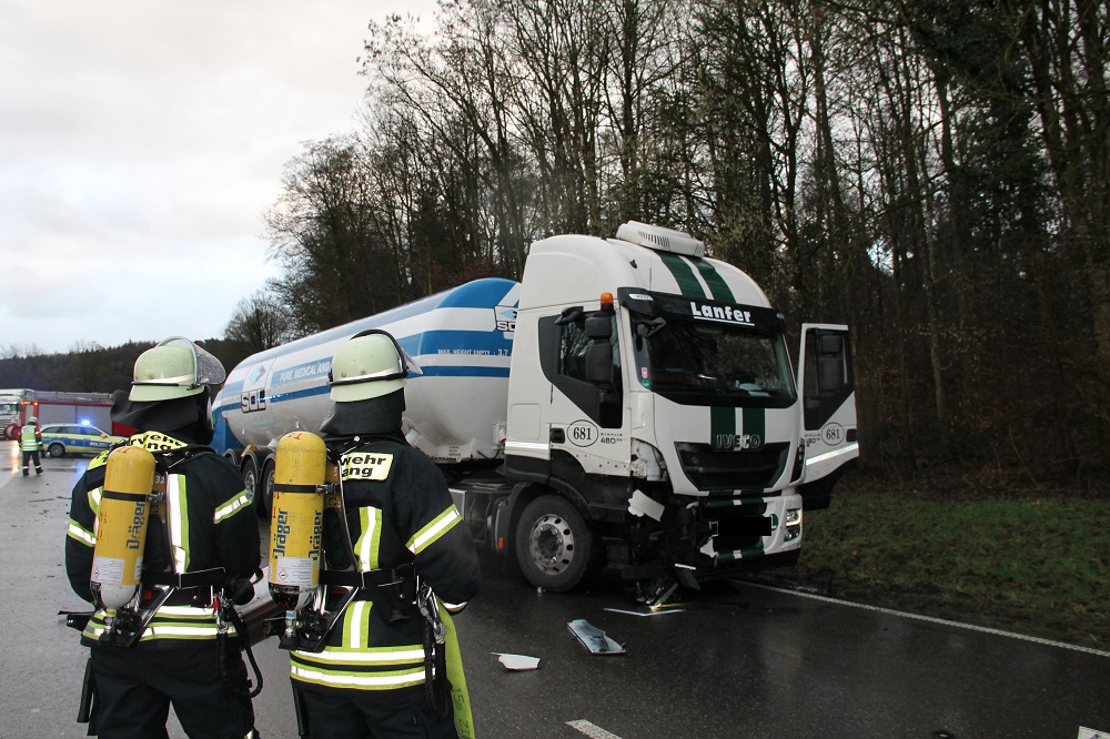 Ein PKW fuhr laut Polizeiangaben auf die Kreuzung B 467 und wurde dabei auf Höhe der Fahrertür von einem Gefahrgut-LKW erfasst. Durch die Wucht des Aufpralls wurde der Mercedes-PKW einen etwa 5 Meter tiefen Hang hinuntergeschleudert. Dort blieb dieser stehen. Der Fahrer wurde dabei schwerst verletzt und eingeklemmt.