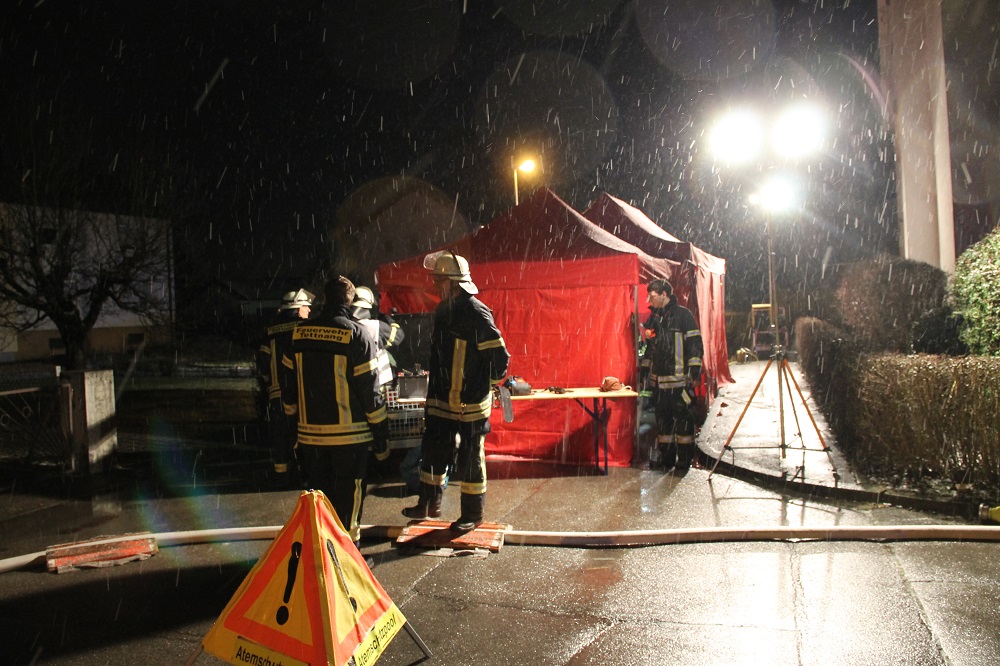 Aufgrund der Einsatzdauer, Witterung (Schneeregen) und der Vielzahl der Atemschutz-Einsätze hatte sich die Einsatzleitung dazu entschlossen, den Atemschutz-Pool aufbauen zu lassen. Wie bereits im vergangen Jahr beim Großbrand der Firma VauDe hatte sich der Pool - in Kooperation mit der SEG des DRK OV Tettnang (Überprüfung der Vitalwerte der Atemschutzgeräteträger nach jedem Atemschutz-Einsatz und Verpflegung der Kräfte) - wieder gelohnt: