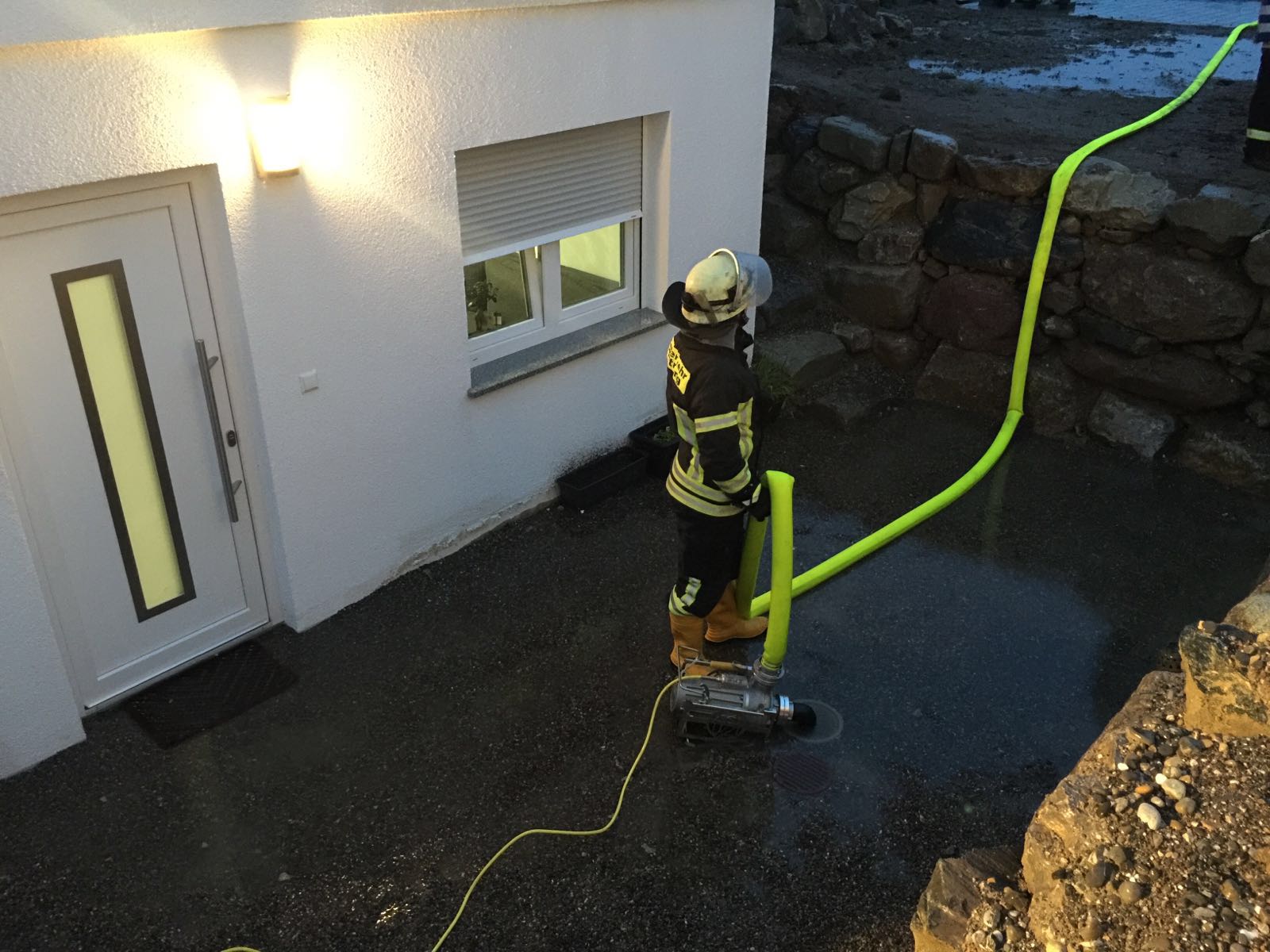Vor einer Einliegerwohnung hatte sich aufgrund eines verstopften Schachtes Wasser auf einer Fläche von 15 Quadratmeter auf einer Höhe von etwa 10cm angestaut. Das Wasser drohte in die Wohnung zu laufen. Mittels Pumpen wurde das Wasser abgesaugt.