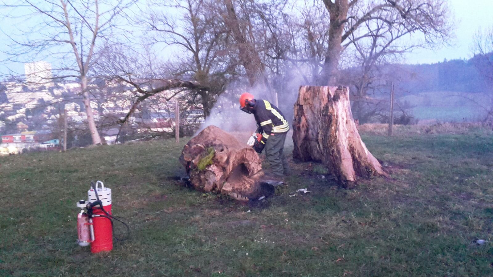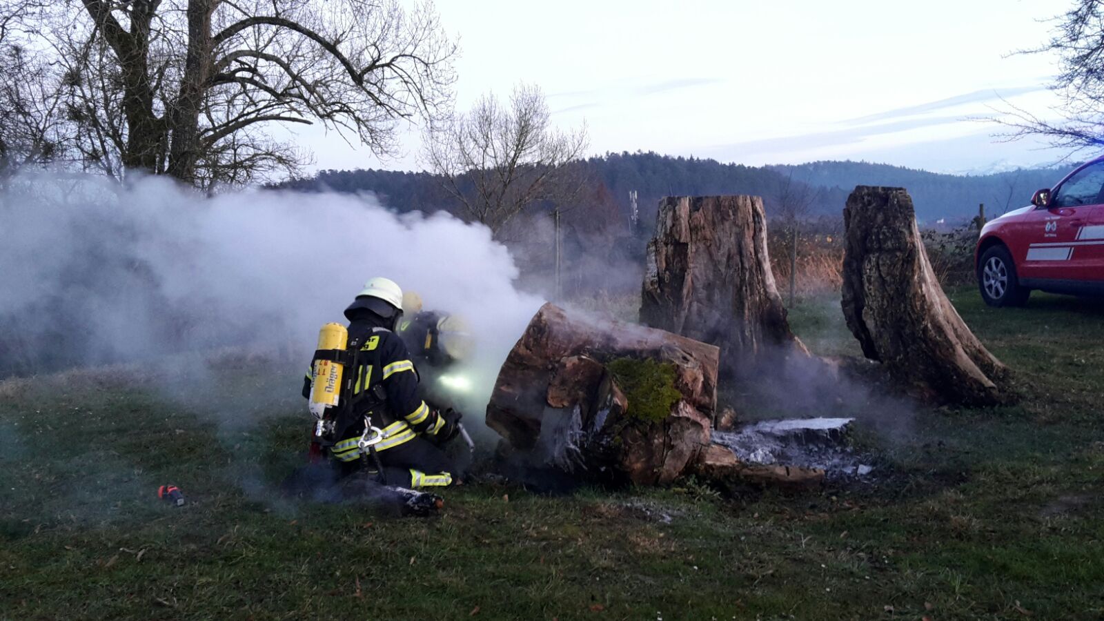 Ein brennender Baumstumpf musste auf dem Lindenbuckel zersägt und anschließend mit zwei HiPress-Löschern gelöscht werden.
