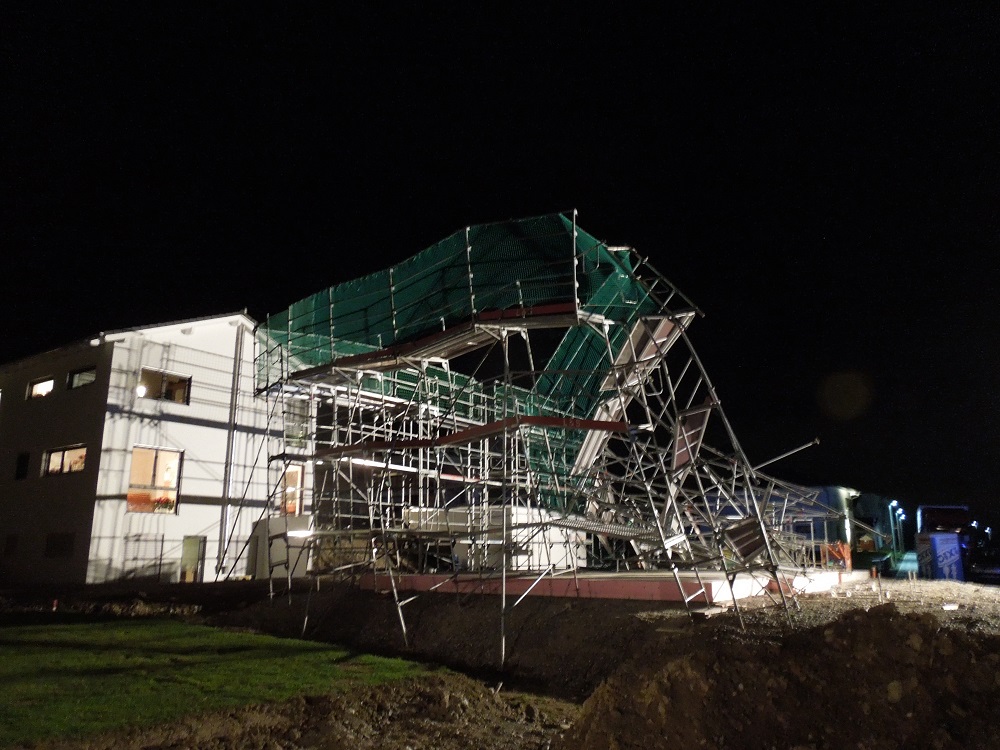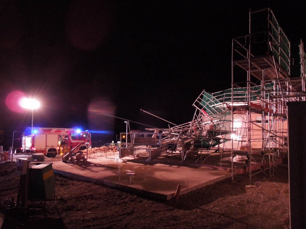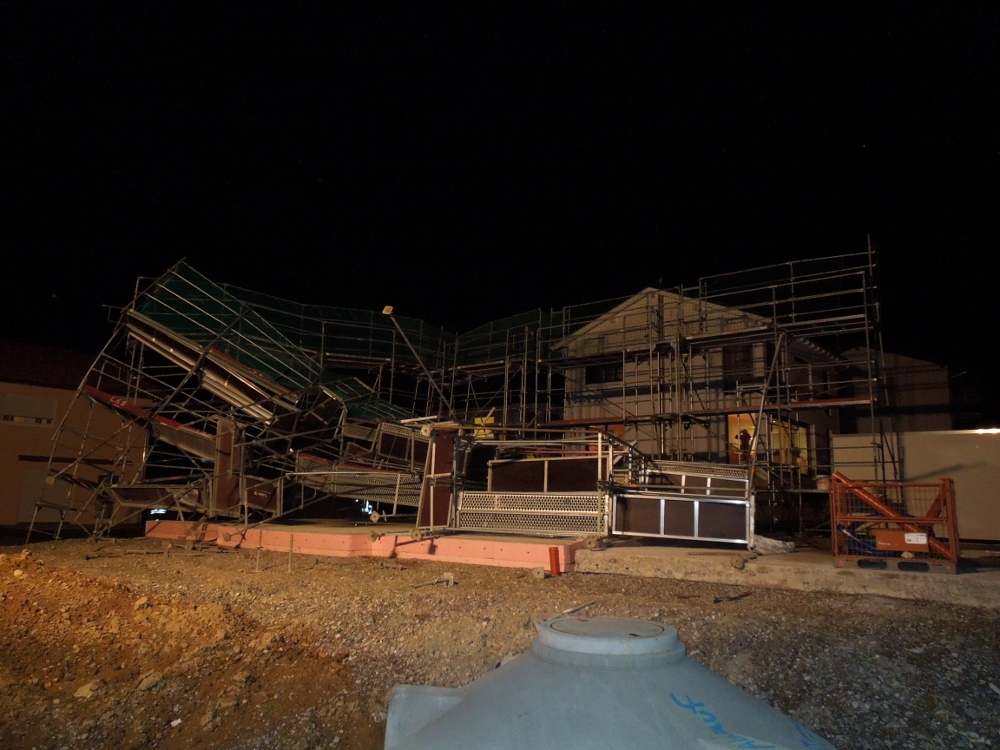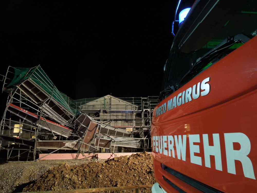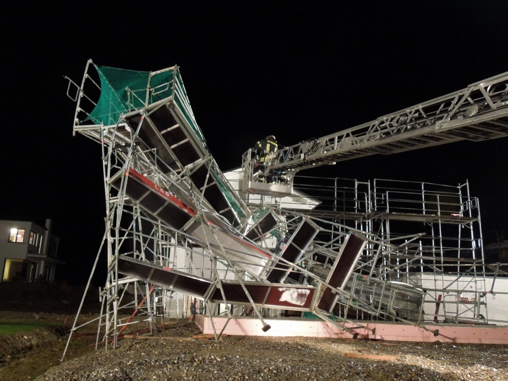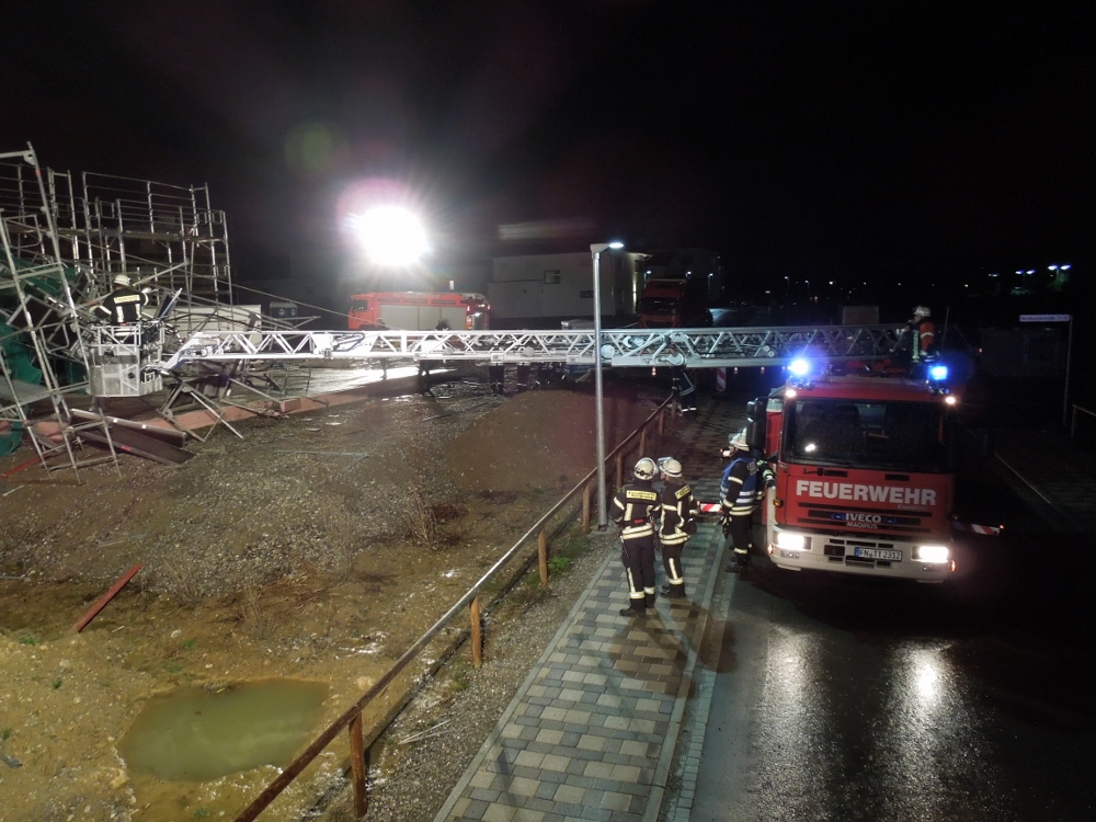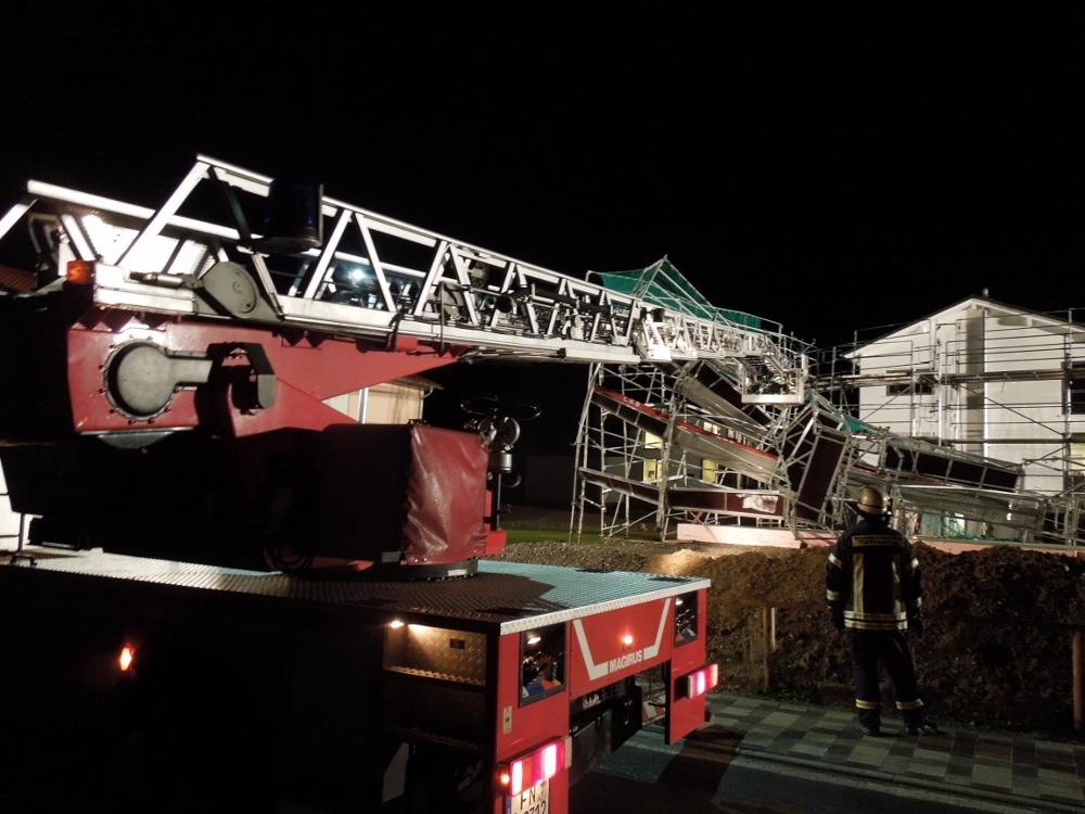 Ein Baugerüst auf einer Baustelle in der Spalterstraße war zum Teil durch das Sturmtief "Ruzica" eingestürzt. Die Feuerwehr Tettnang sicherte das Gerüst und baute es partiell mit Unterstützung der Drehleiter zurück.