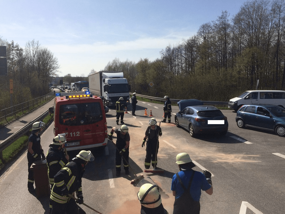 Nach einem Verkehrsunfall auf der L 333 Abfahrt B 467 mussten Betriebsmittel aufgenommen werden. Anschließend wurden Ölspurschilder gesetzt.
