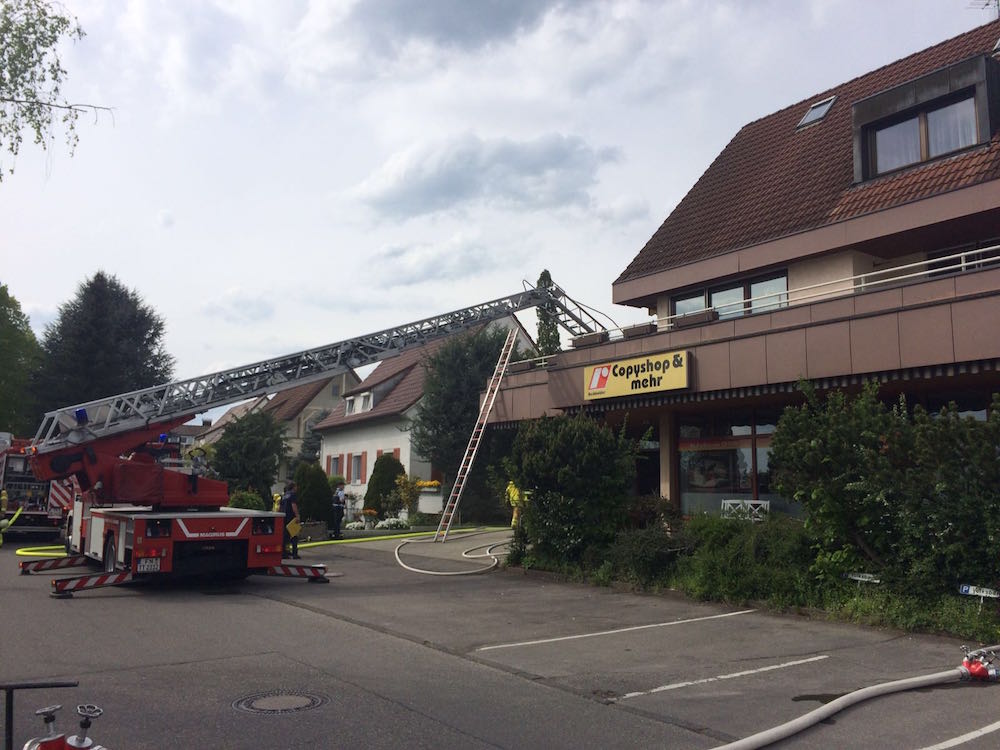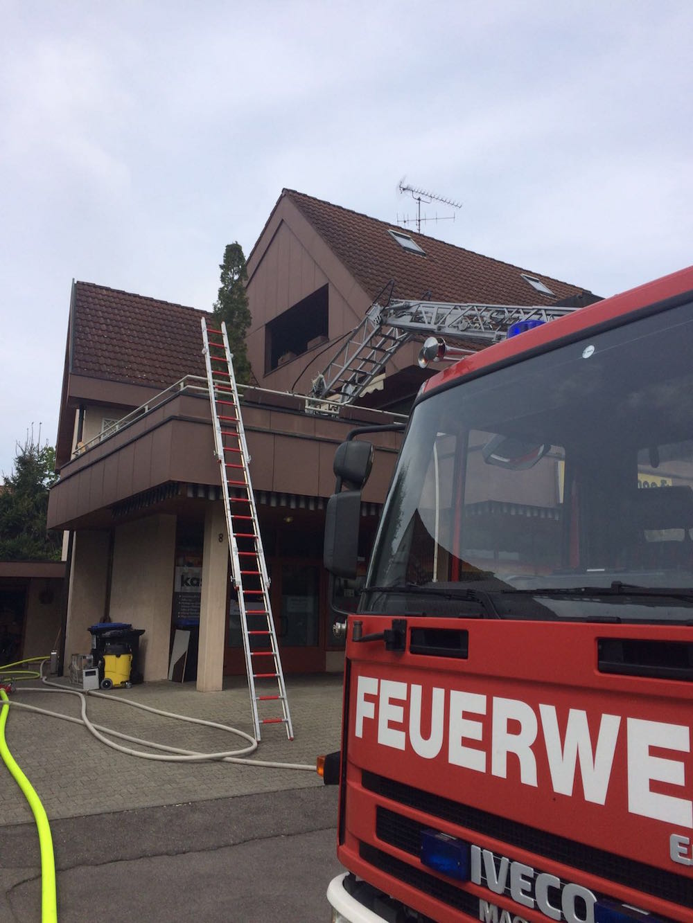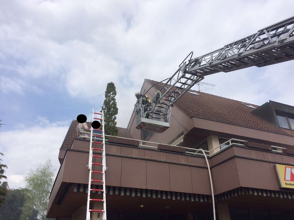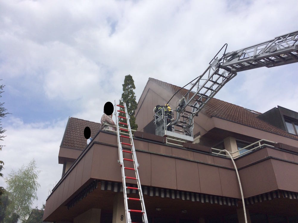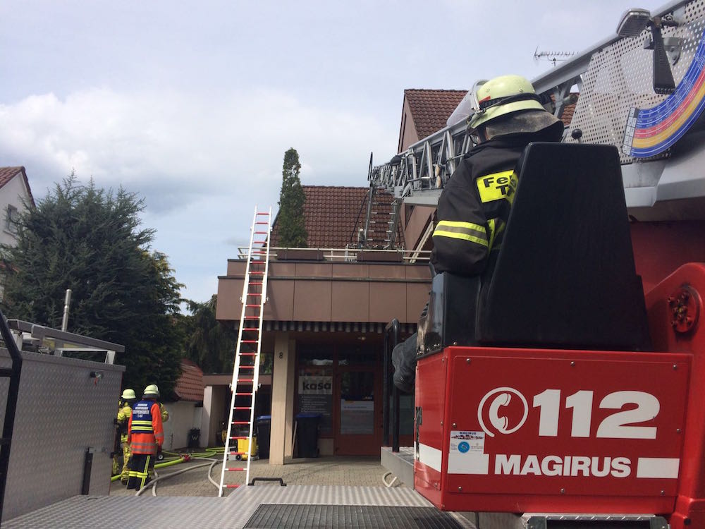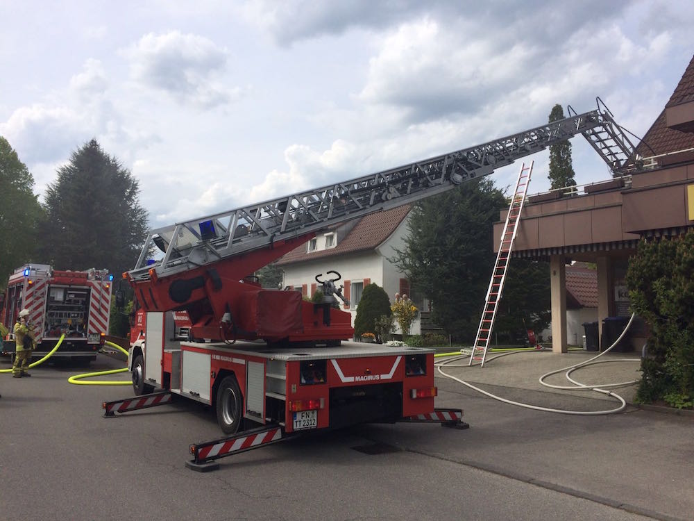 Mit der Drehleiter wurden bei einem F3 in Meckenbeuren zwei Personen von einem Balkon gerettet, da durch den Kellerbrand die darüberliegende Wohnung, in welcher sich die beiden Personen befanden verraucht wurde, und der Fluchtweg (Treppehaus) ebenfalls verraucht war. Atemschutz-Trupps unterstützten die Feuerwehr Meckenbeuren im Innenangriff. Außerdem wurden weitere Atemschutzgeräte aus Tettnang zur Einsatzstelle gebracht und an die entsprechenden PA-Trupps verteilt.