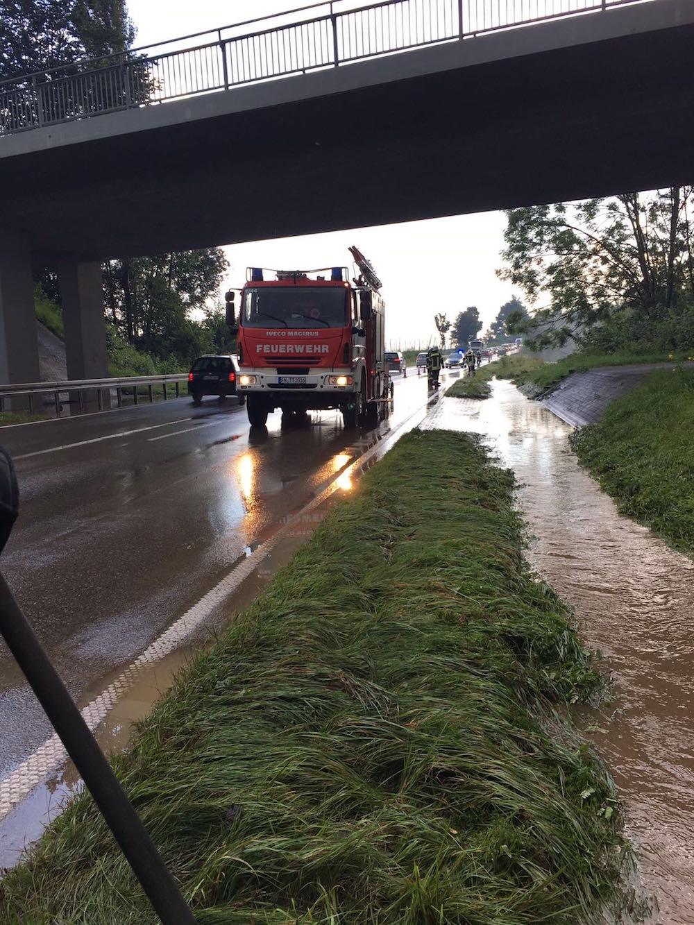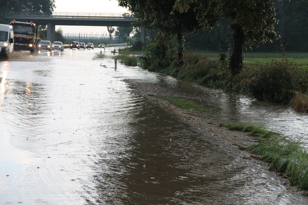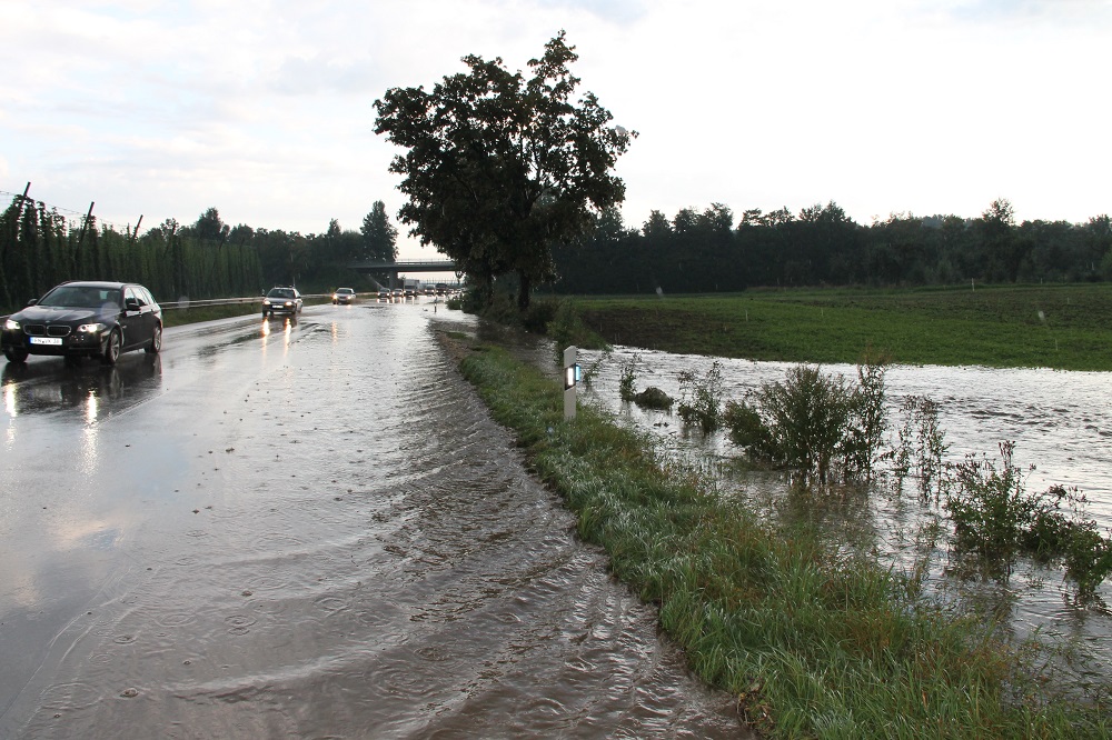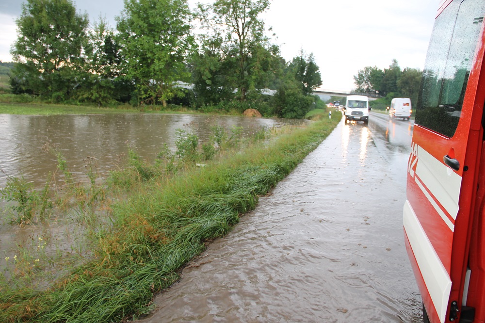 Die B 467 wurde durch die starken Regenfälle kurzzeitig überschwemmt. Die Feuerwehr sicherte die Einsatzstelle ab, bis sich die Lage beruhigte.