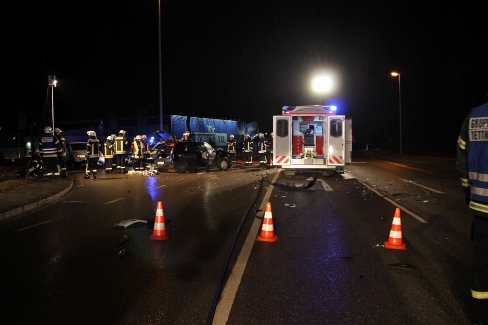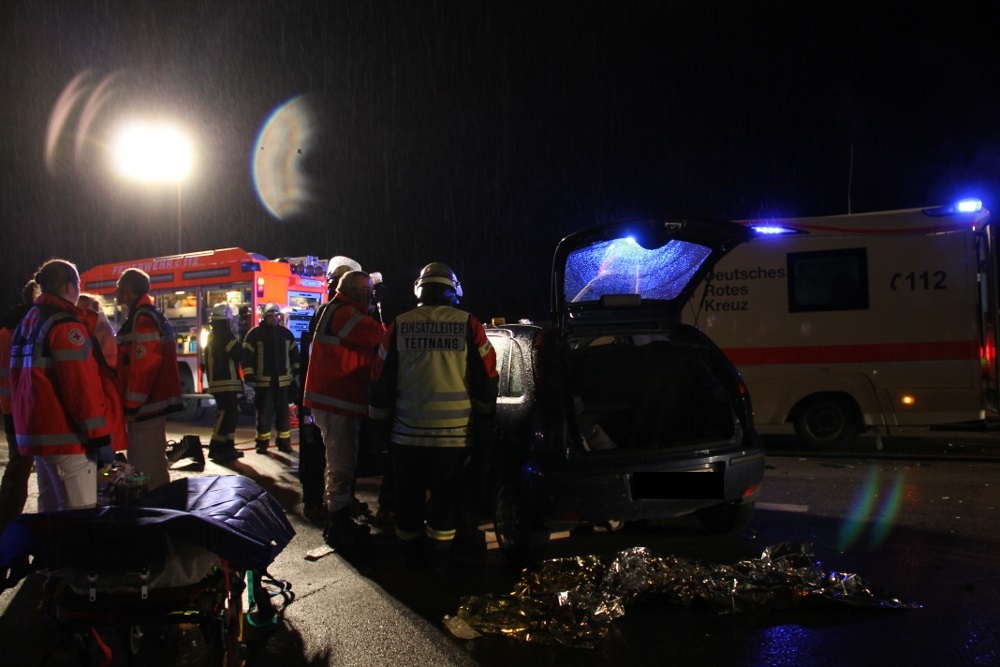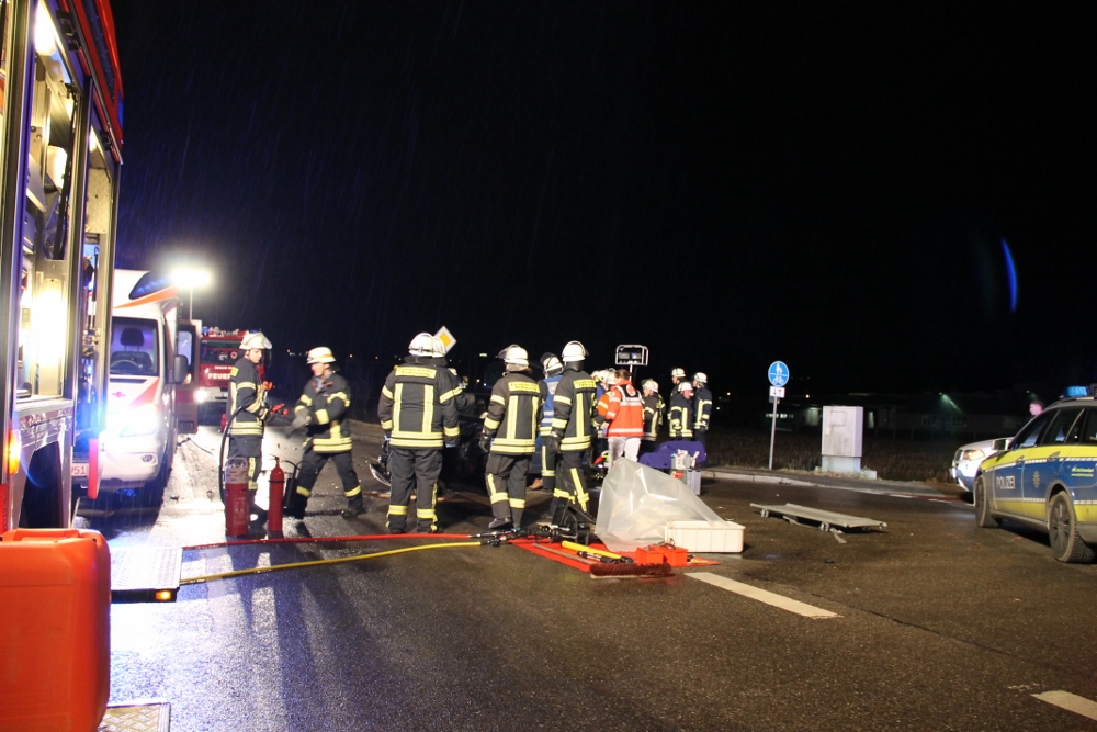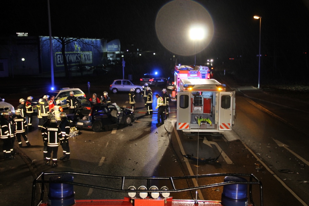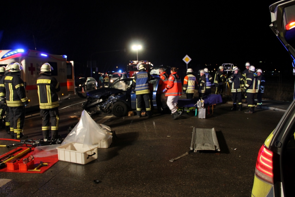 Bei einem Verkehrsunfall zwischen zwei PKW auf einer Kreuzung bei Bürgermoos musste die Feuerwehr Tettnang eine Person aus einem PKW befreien. Insgesamt wurden bei dem Unfall drei Personen verletzt. Die Feuerwehr leuchtete die Unfallstelle aus und sicherte diese ab.