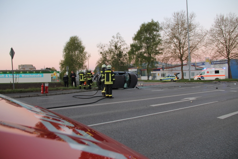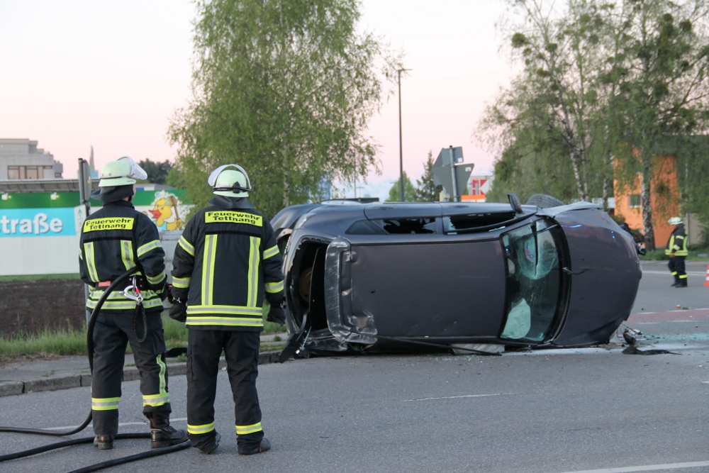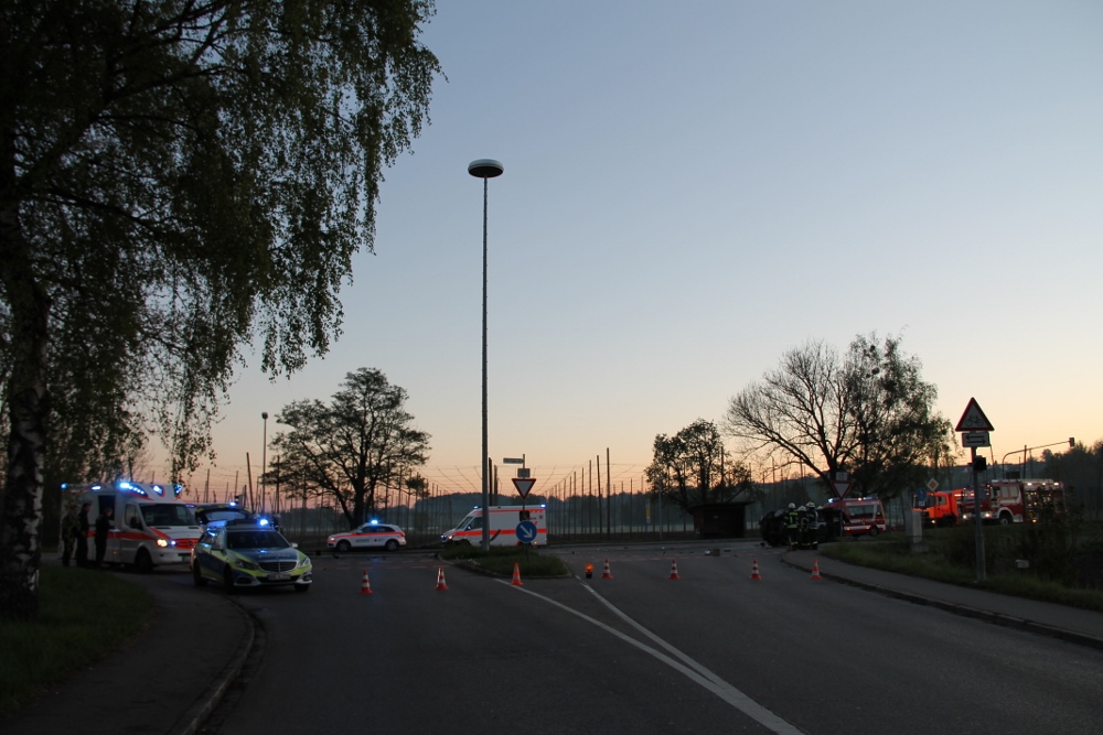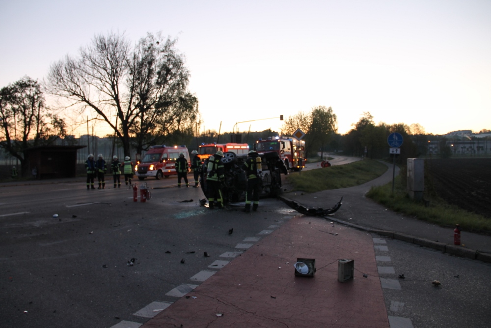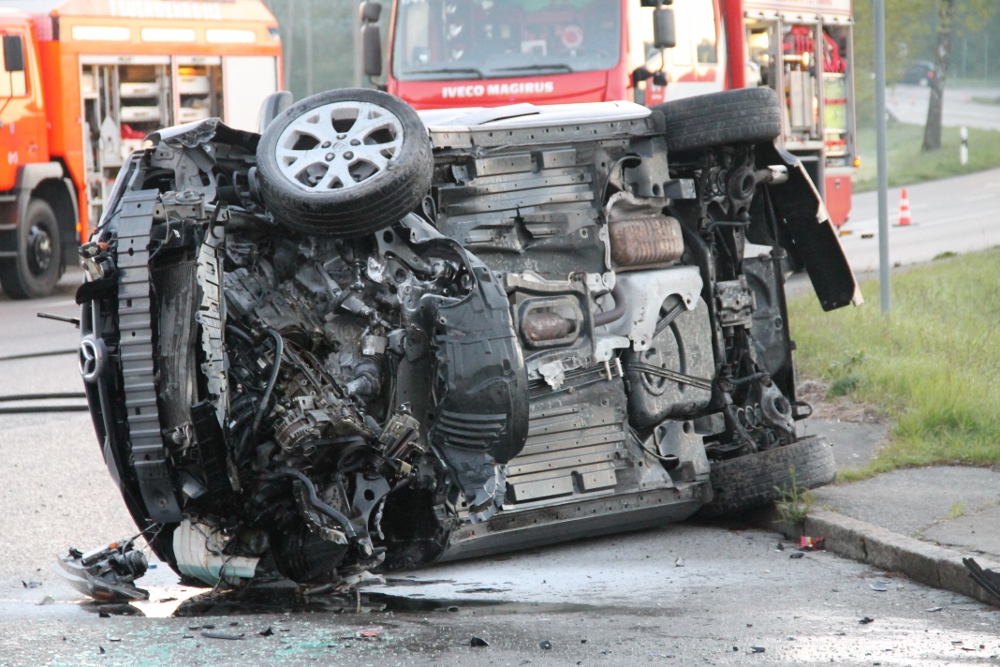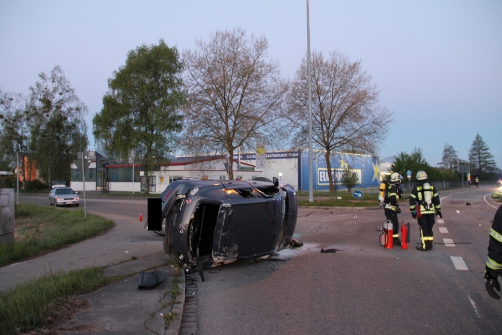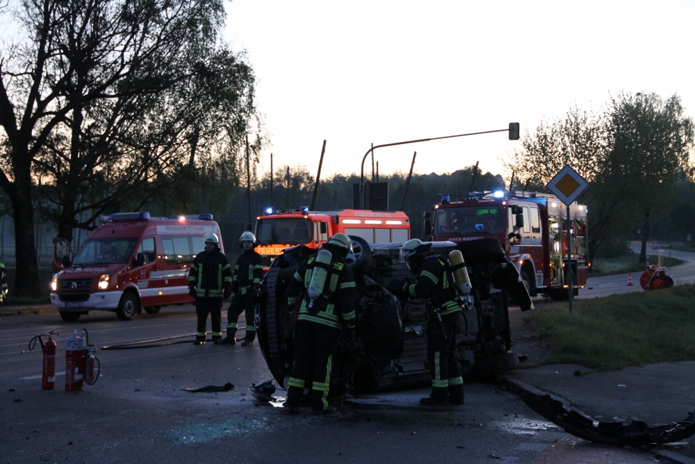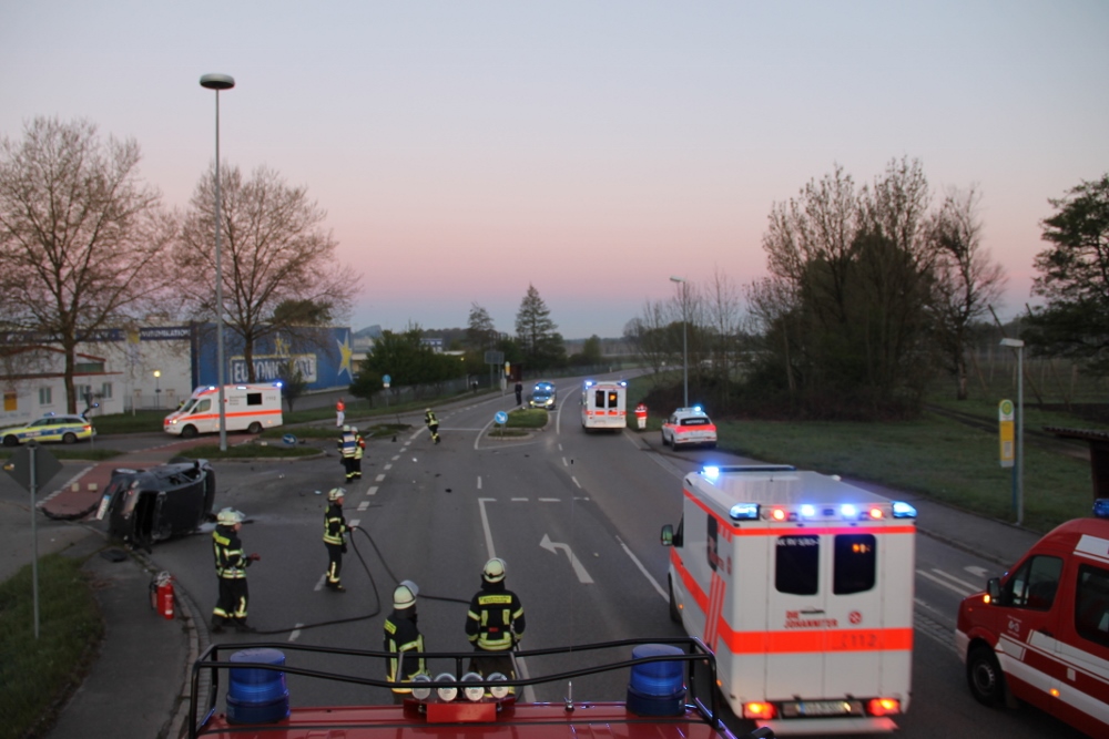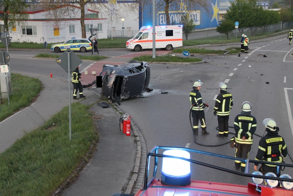 Am frühen Sonntagmorgen wurde der Feuerwehr ein PKW-Brand mit einer Person in dem Fahrzeug gemeldet. Als die Kräfte an der Einsatzstelle ankamen, lag ein PKW auf der Seite. Glücklicherweise waren keine Personen mehr in dem PKW.