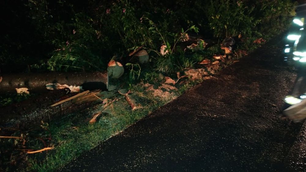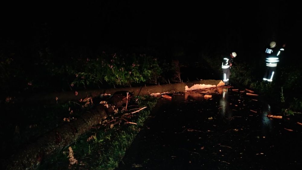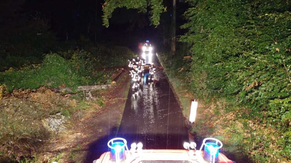 In Tannau waren mehrere Bäume auf die Straße gestürzt. Neben den Aktivitäten der Feuerwehr wurde der Bauhof zur Sperrung der Straße angefordert.