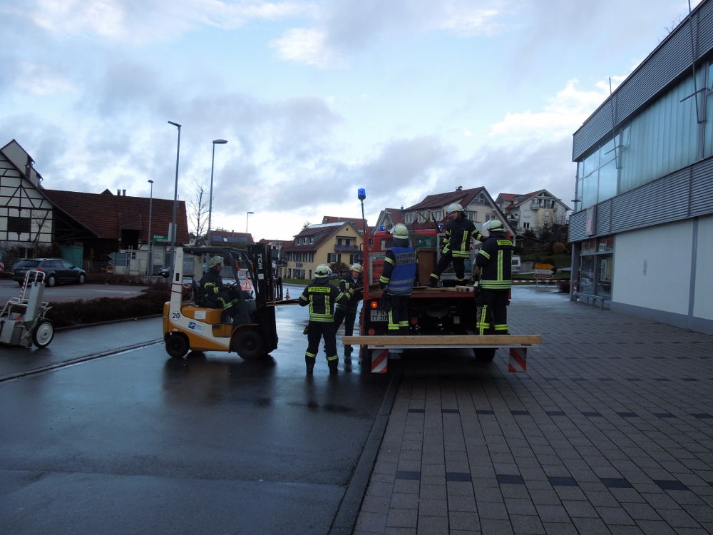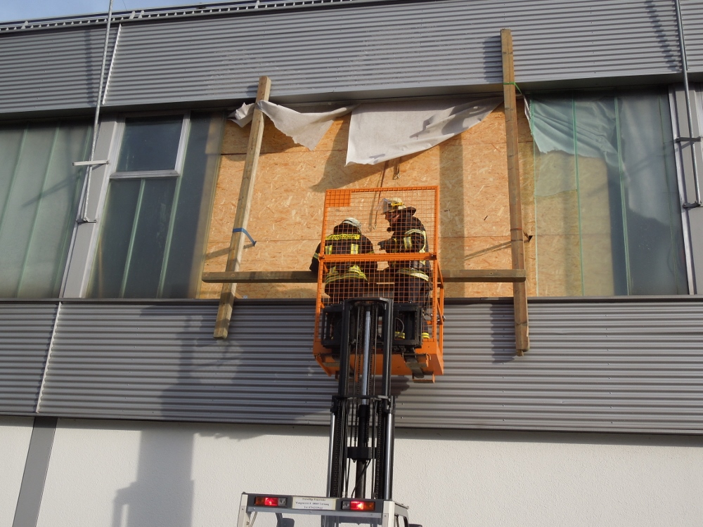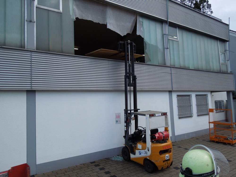 Die Feuerwehr verschloss das Fenster mittels OSB-Platten, Balken und Spanngurten. Hier wurde der Gabelstapler zur Unterstützung eingesetzt. Anschließend wurde der Parkplatz großflächig abgesperrt und an den Besitzer übergeben.