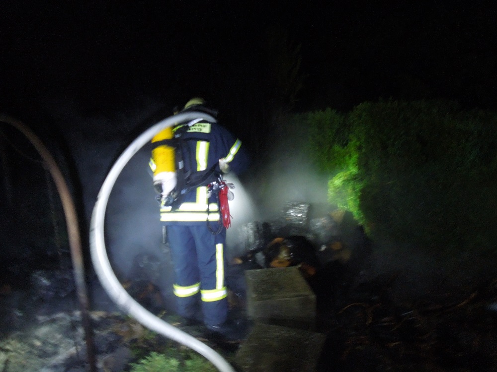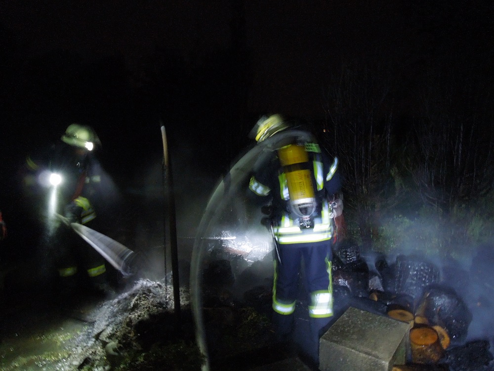 Eine in Vollbrand stehende Hecke sowie ein daneben angrenzender Holzstapel wurde Samstagnacht von der Feuerwehr mit einem C-Rohr gelöscht. Das Brandgut wurde danach mit der Wärmebildkamera kontrolliert.