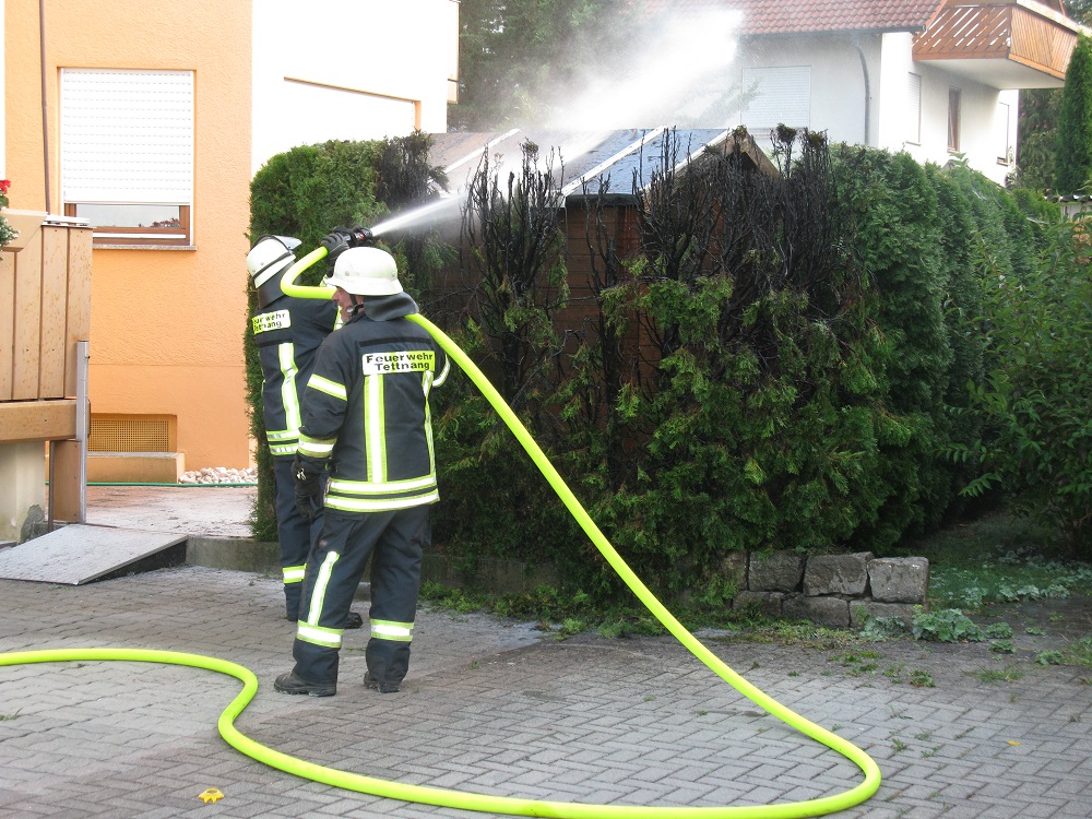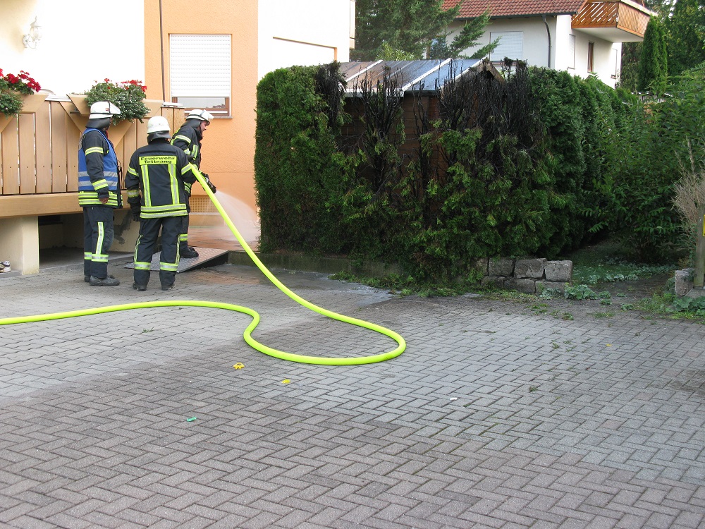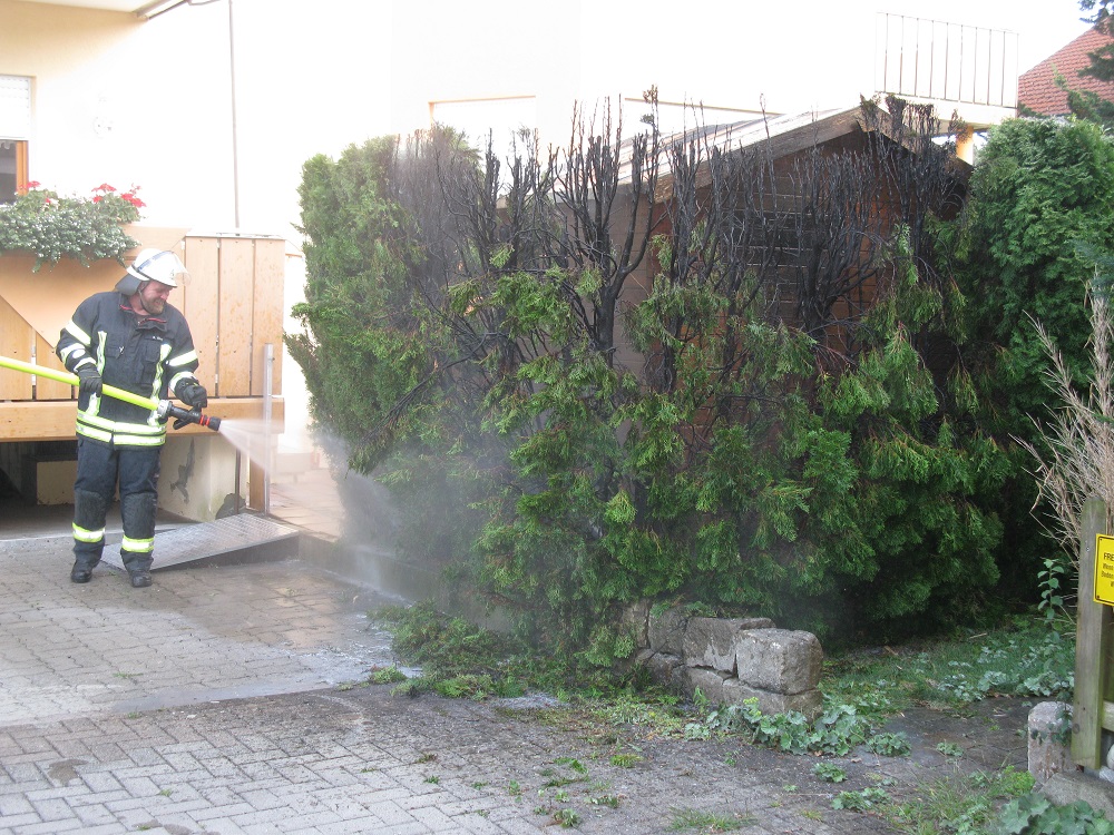 EIn Heckenbrand in Tettnang-Bürgermoos machte den Einsatz der Feuerwehr erforderlich. Mit einem C-Rohr wurde die Hecke abgelöscht und anschließend mit der Wärmebildkamera kontrolliert.