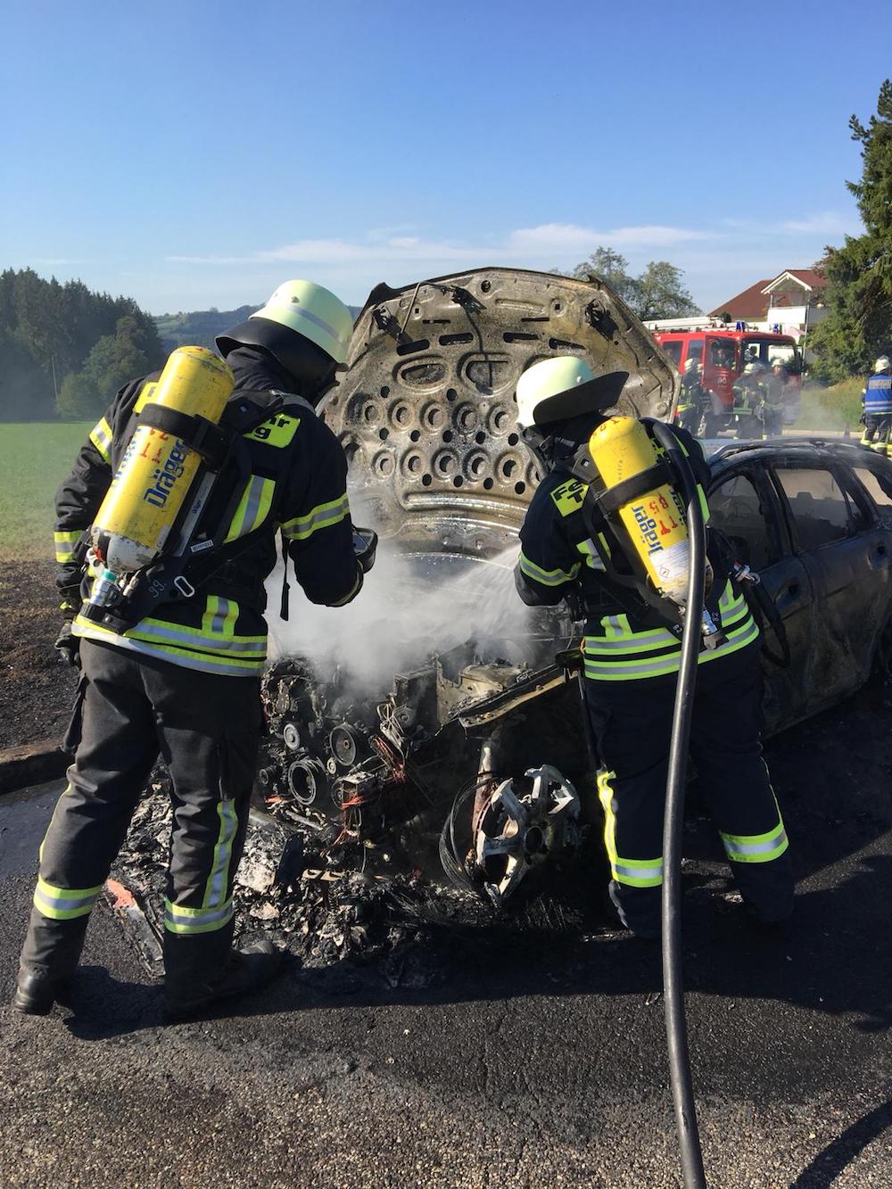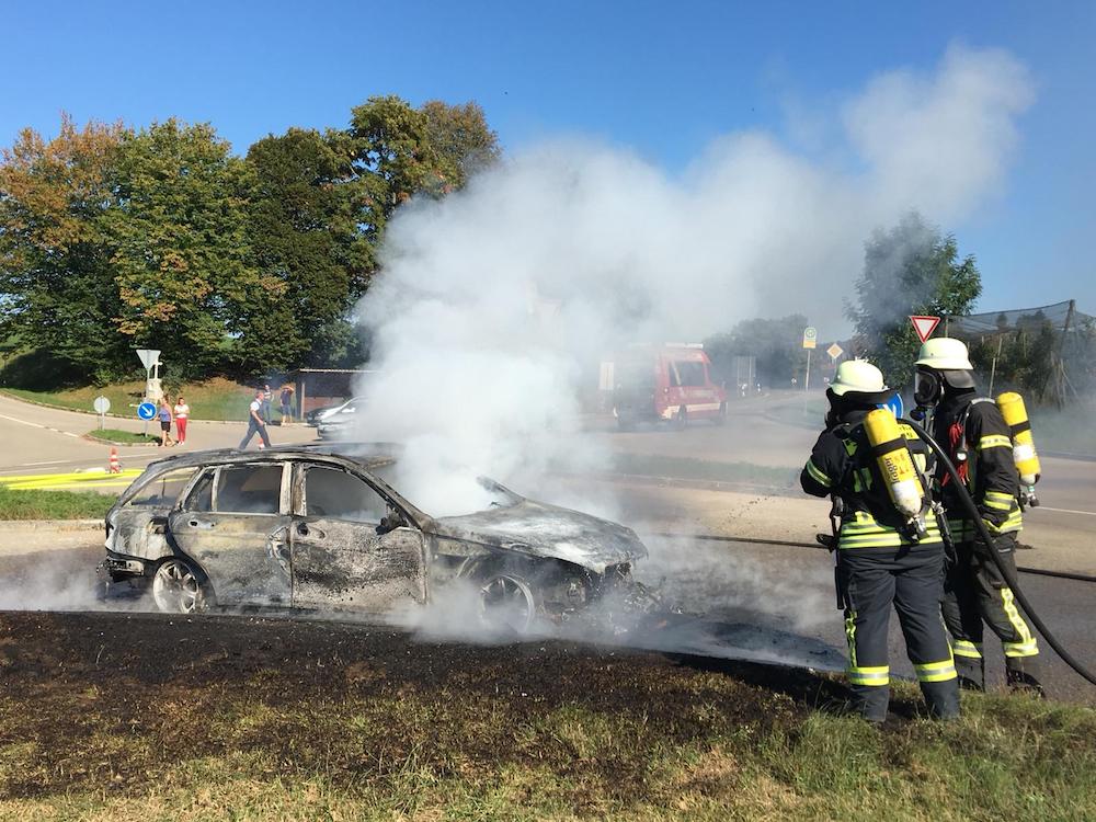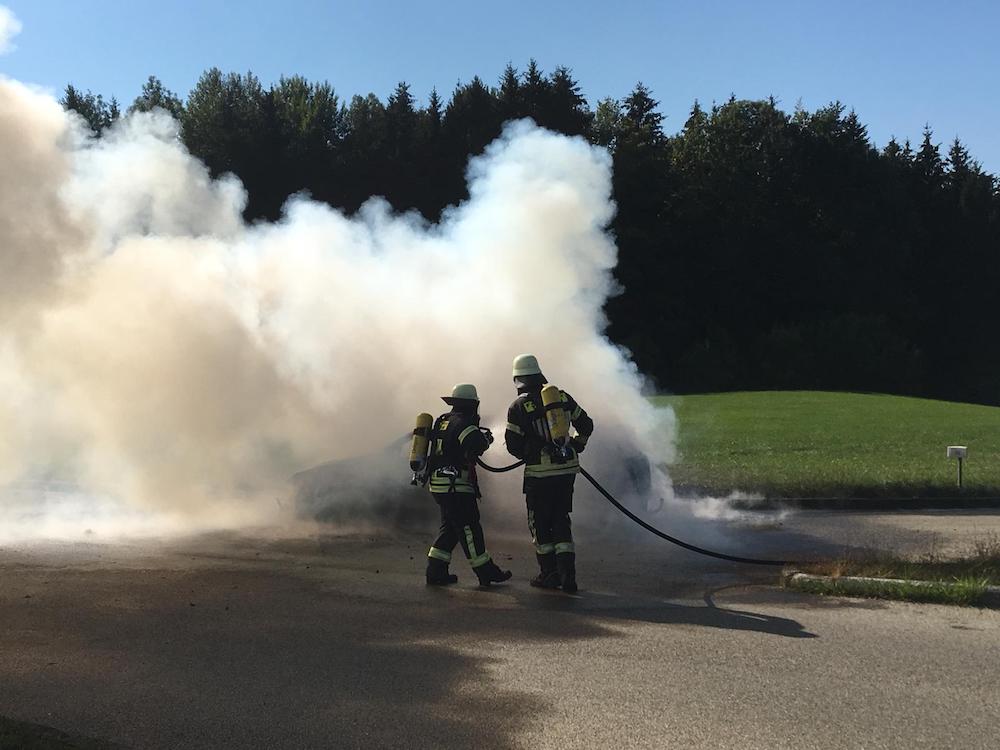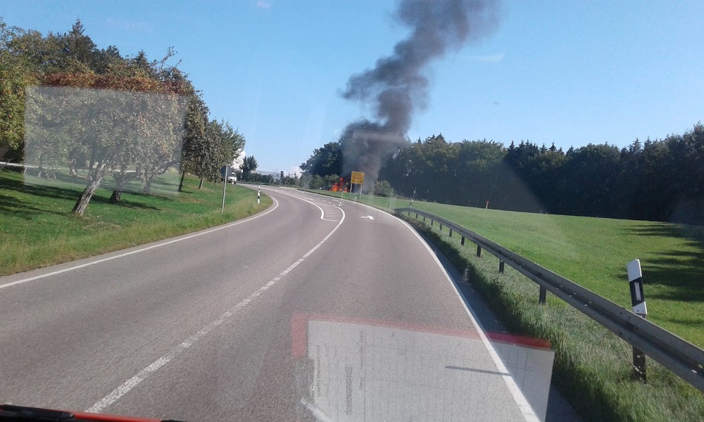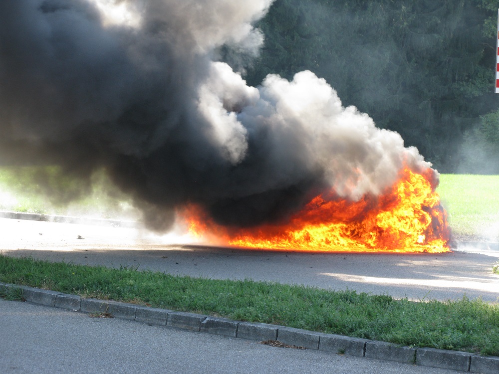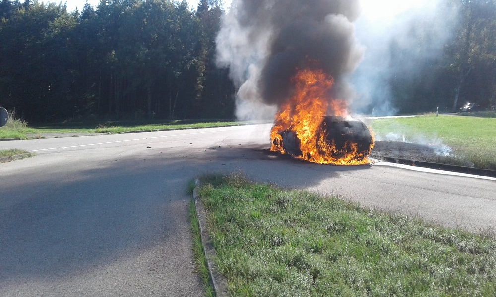 Bereits aus großer Entfernung war die Rauchwolke sichtbar, die von einem in Vollbrand stehendem PKW in Baldensweiler ausging. Nachdem die Feuerwehr eingetroffen war konnte der PKW rasch unter Atemschutz gelöscht werden. Jedoch gelangte eine unbekannte Menge Diesel des Fahrzeugs über einen Straßeneinlaufschacht in die damit verbundenen Kanäle.