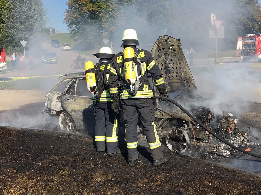 F1 - PKW in Vollbrand, Diesel droht in Gewässer zu laufen