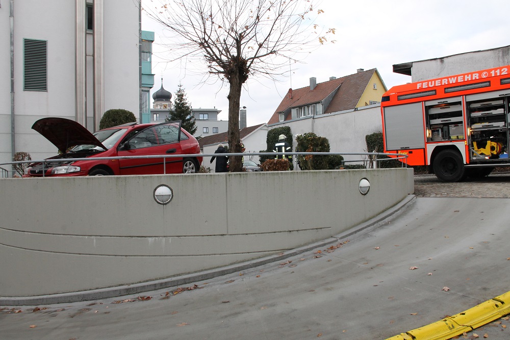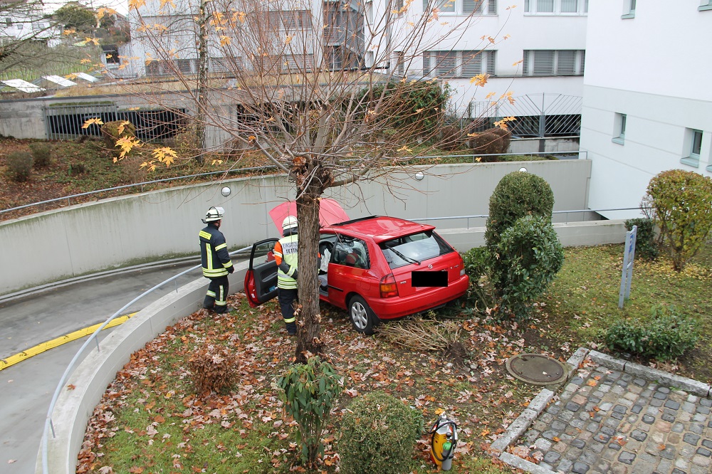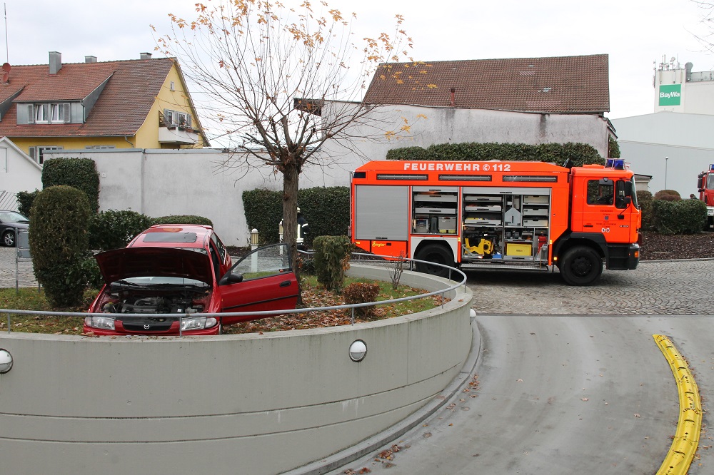 In der Tettnanger Innenstadt ereignete sich ein Verkehrsunfall: Eine Frau prallte mit ihrem PKW gegen die Mauer einer Tiefgarageneinfahrt.